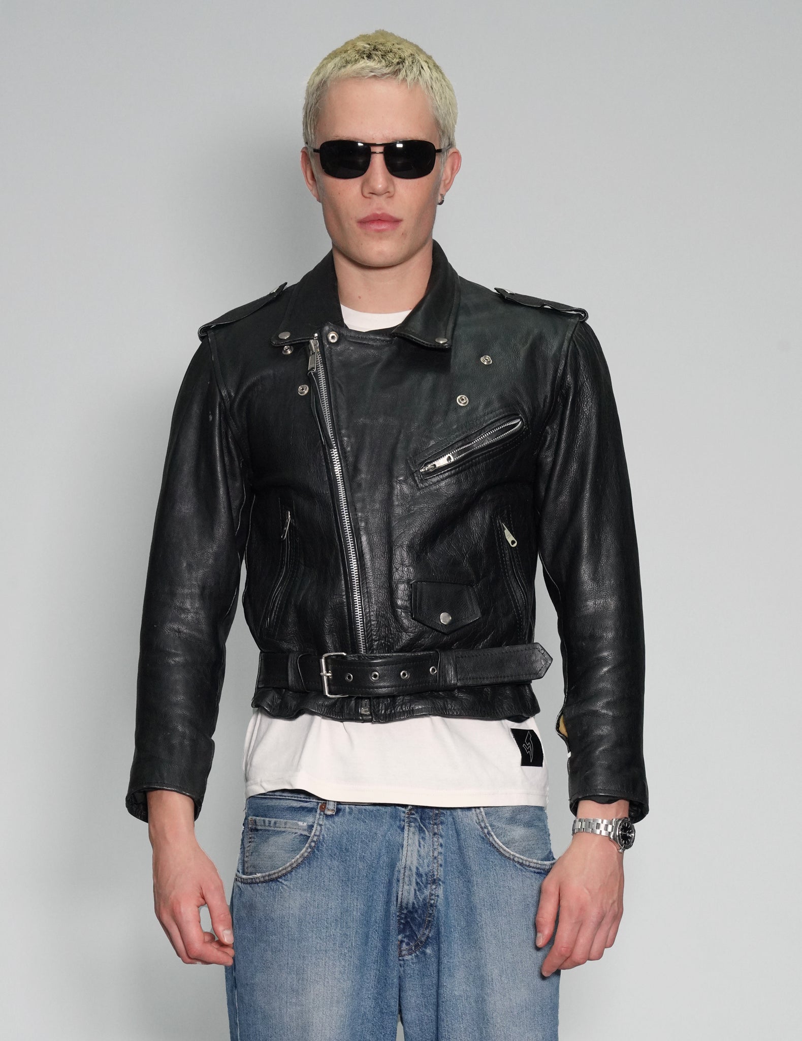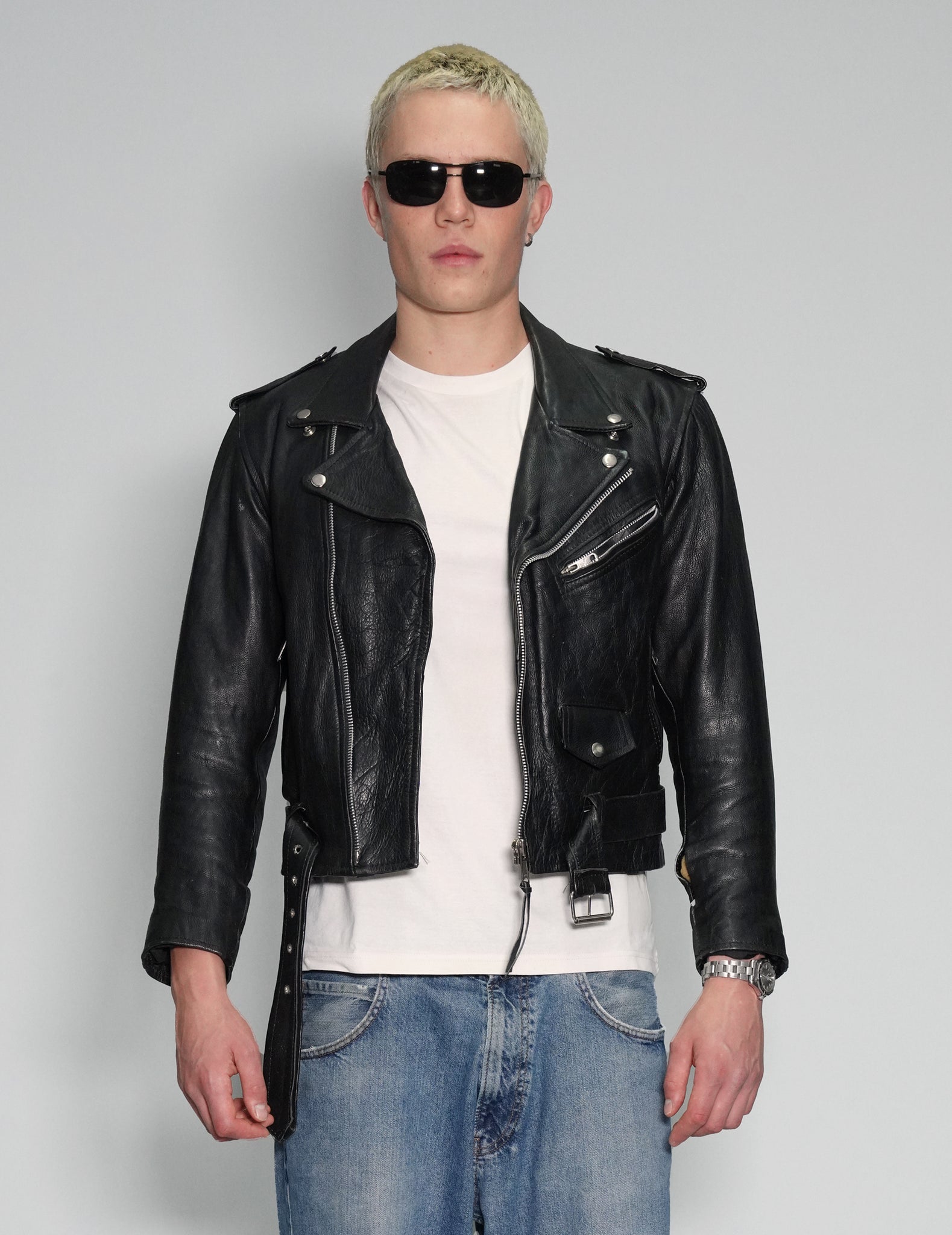 Iconic vintage leather biker jacket, made famous by Marlon Brando in the film "The Wild One" . Featuring pop-adjustable collars, zip front, diagonal zip breast pocket, inside breast pocket, dual zip waist pockets and adjustable belt on the waist.