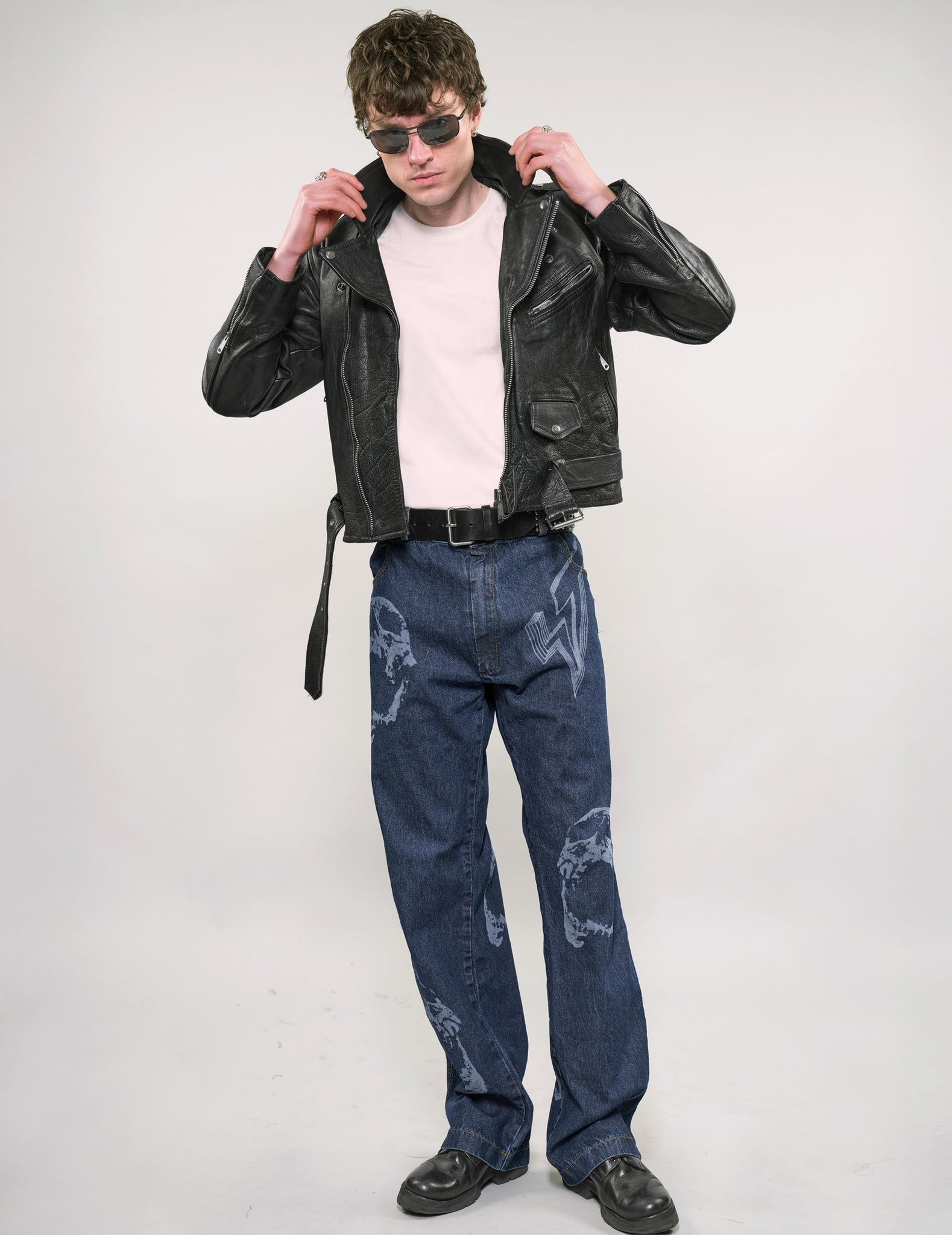 Her Majesty’s Prison Service deadstock denim jeans. Hand made in the UK at Her Majesty’s Pleasure with “Memento Mori” Skull laser printed in our East London laundry. These jeans come in one supersize only (40"), to be worn belted in for that oversize, super baggy denim jeans look. Wear them high waisted or on the hips, roll up the hems and wear them with biker boots - perfect for vintage rockers and fugitives on the run!