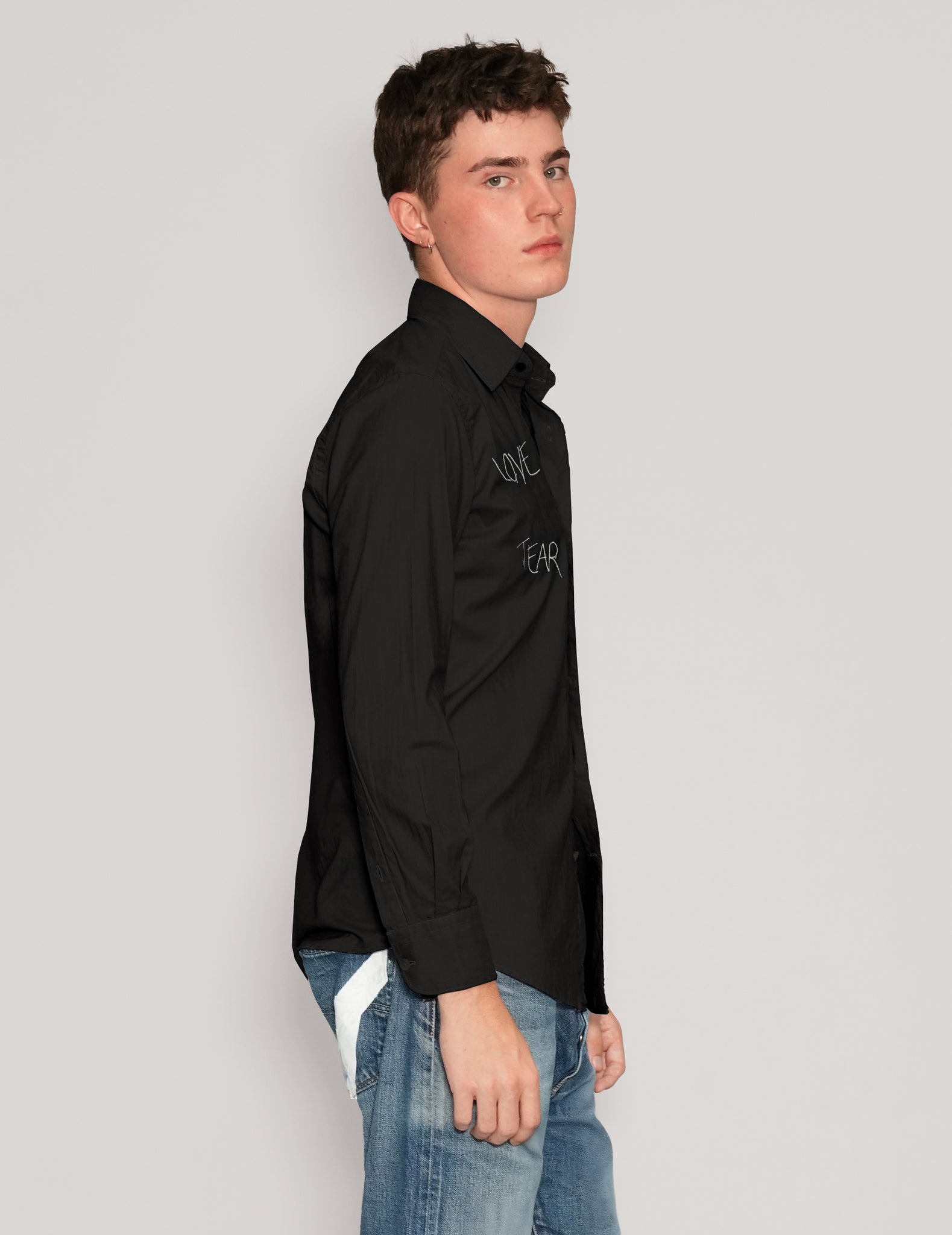 Classic mens black collared shirt, 100% cotton. Customised with "Love Will Tear Us Apart" embroidery.