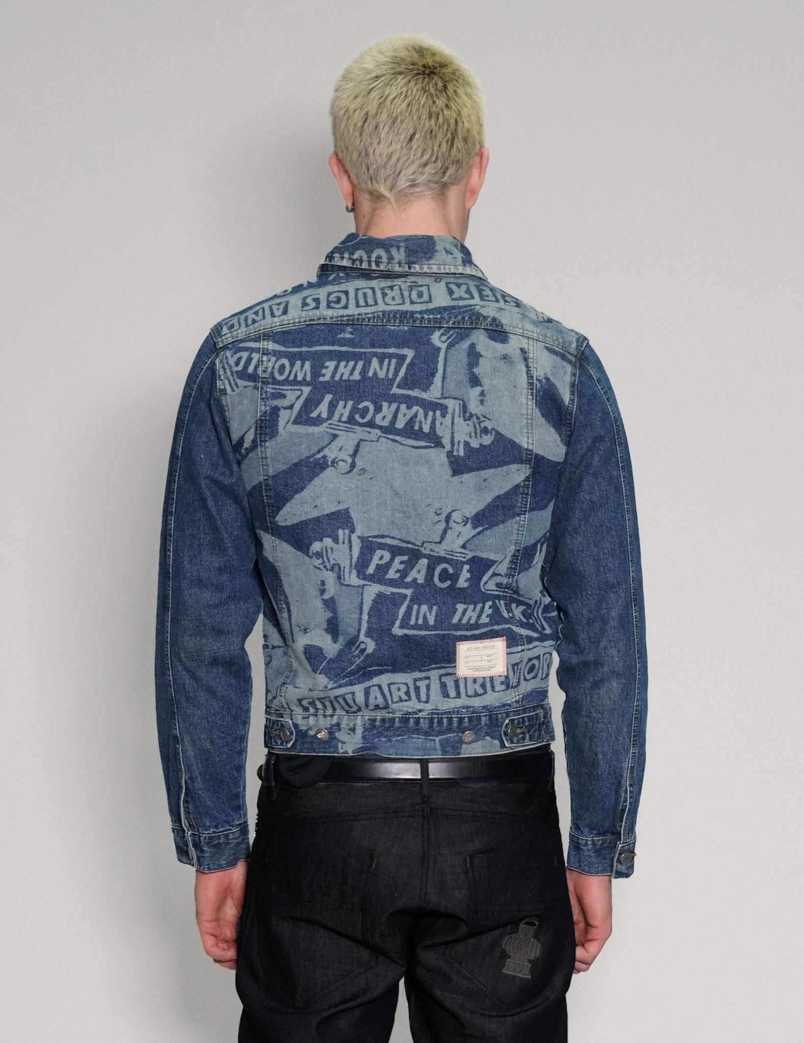 'Peace' print, vintage denim jacket. Each piece is super rare and laser printed in our East London tailoring shop. Features our original graphic print with "Stuart Trevor, Peace in the UK, Anarchy in the World and S'x D'ugs and Rock n Roll".