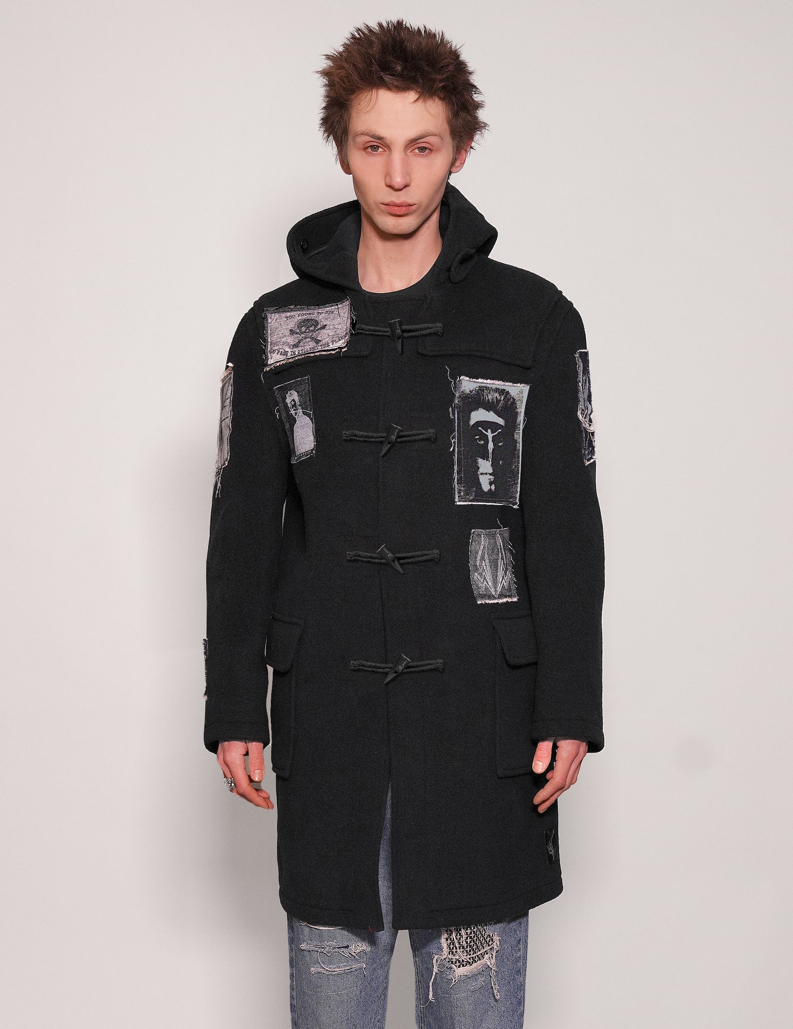 Mens 100% wool, black duffel coat, with adjustable horn toggles down the front with cotton rope fasteners. Large flap pockets and hidden inside button-fastened patch pocket. Customised with ST patches on the front and our favourite Rock n Roll icon mugshot printed patch on the back.