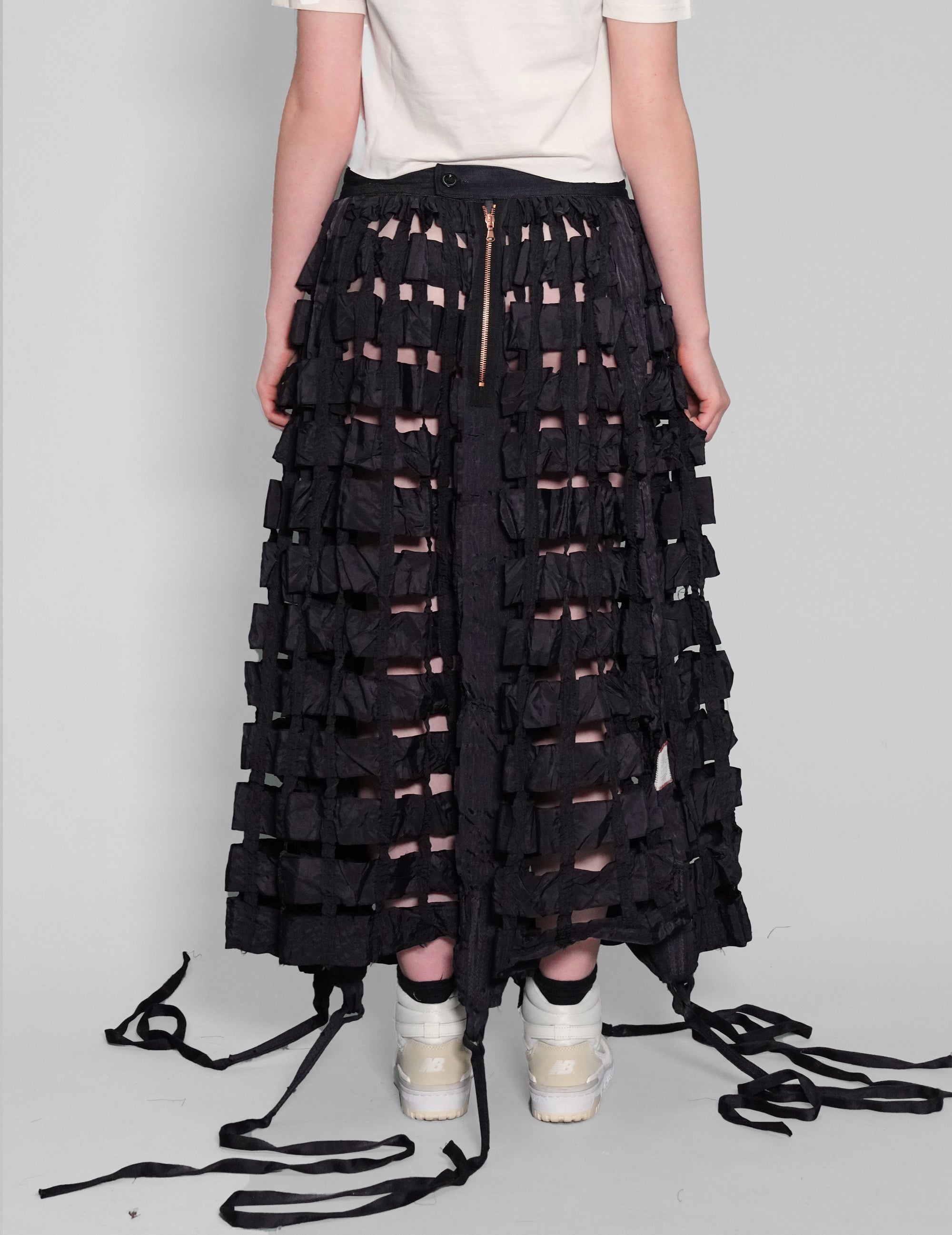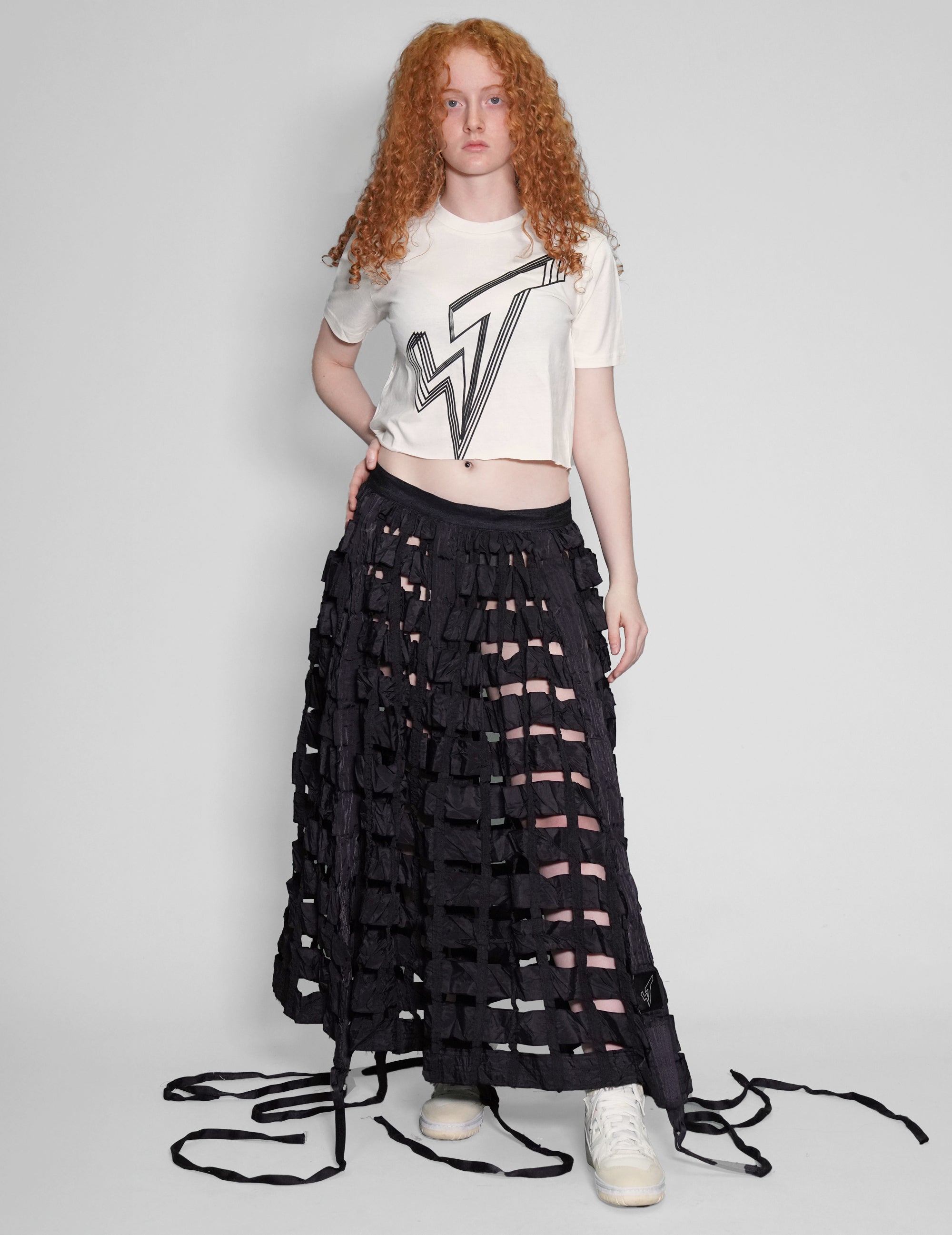 A Stuart Trevor original, the Parachute dress is recycled and made out of original Eurofighter drag chutes. The drag chutes are used in order to very quickly slow down the Eurofighter on icy or wet runways. This black one has been over dyed. Handmade in our East London tailoring shop, as each one is individual, they may differ slightly from the photos.