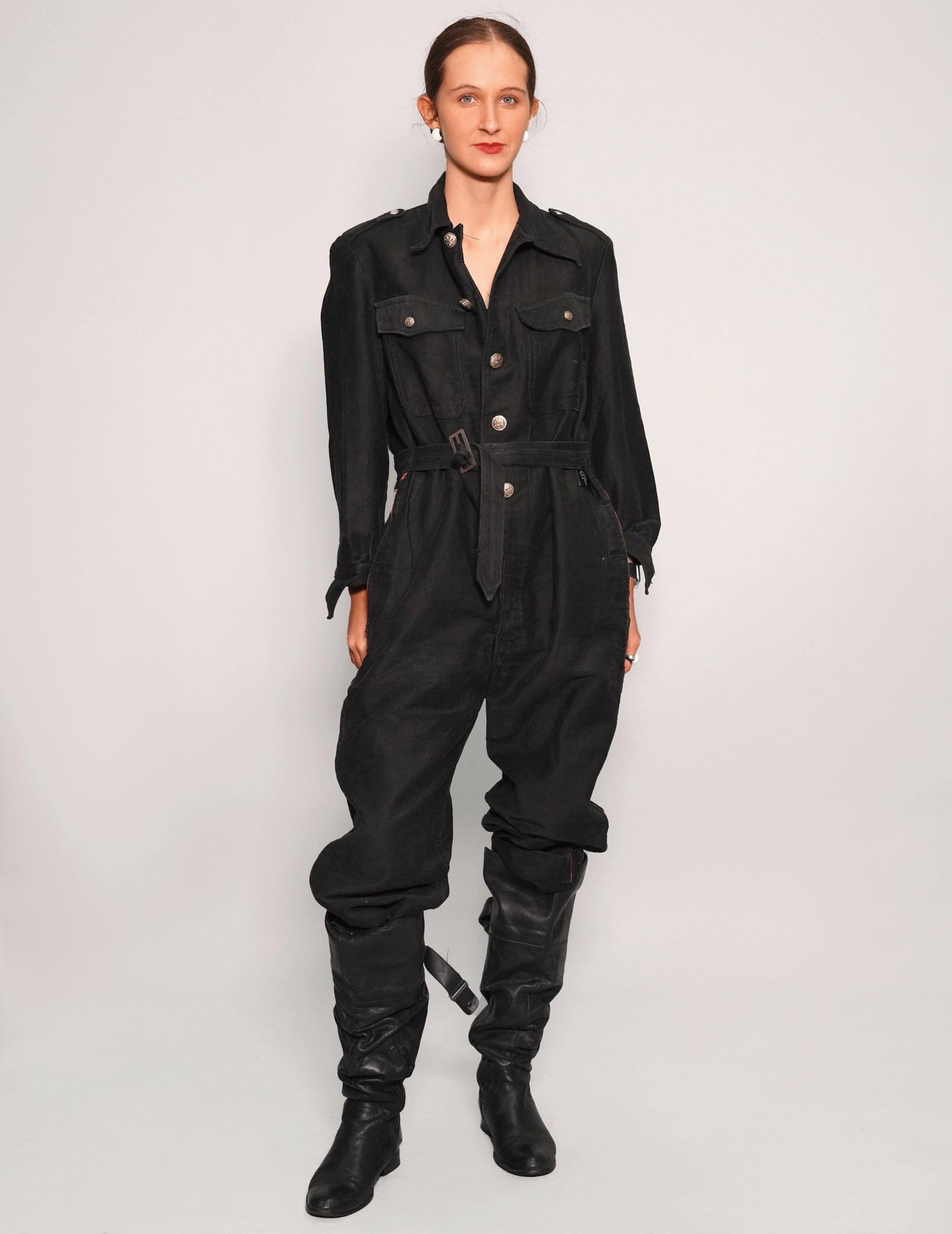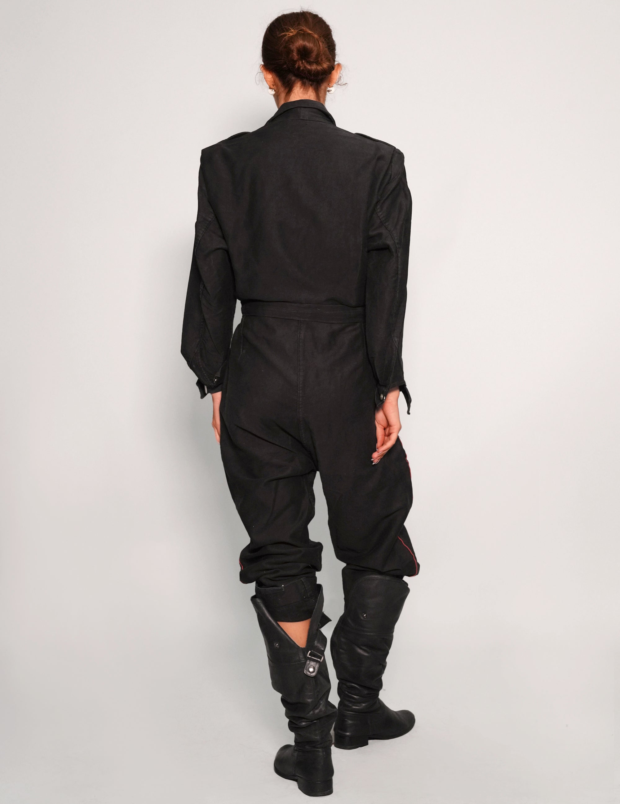 Original vintage British Army Royal Tank Regiment overalls, 100% cotton. With adjustable waist belt, red stripe on legs and breast pcokets.