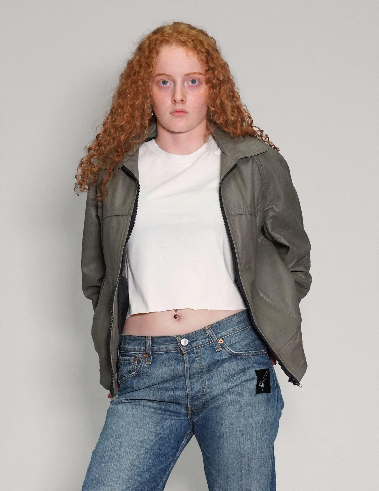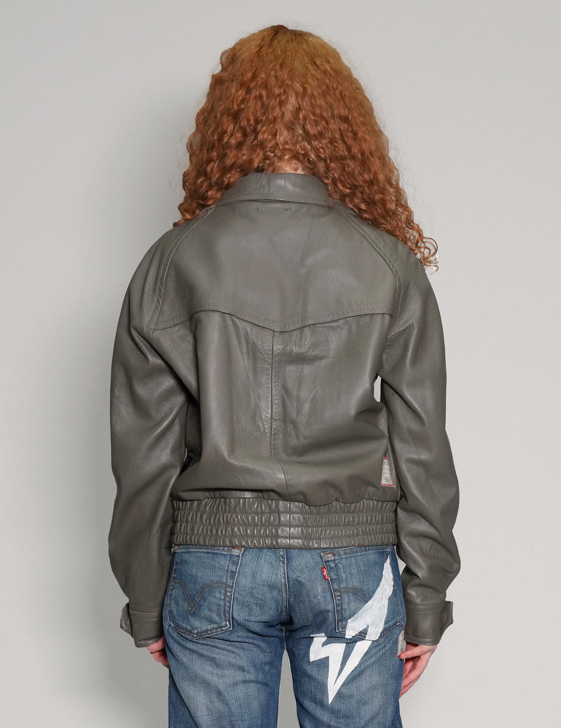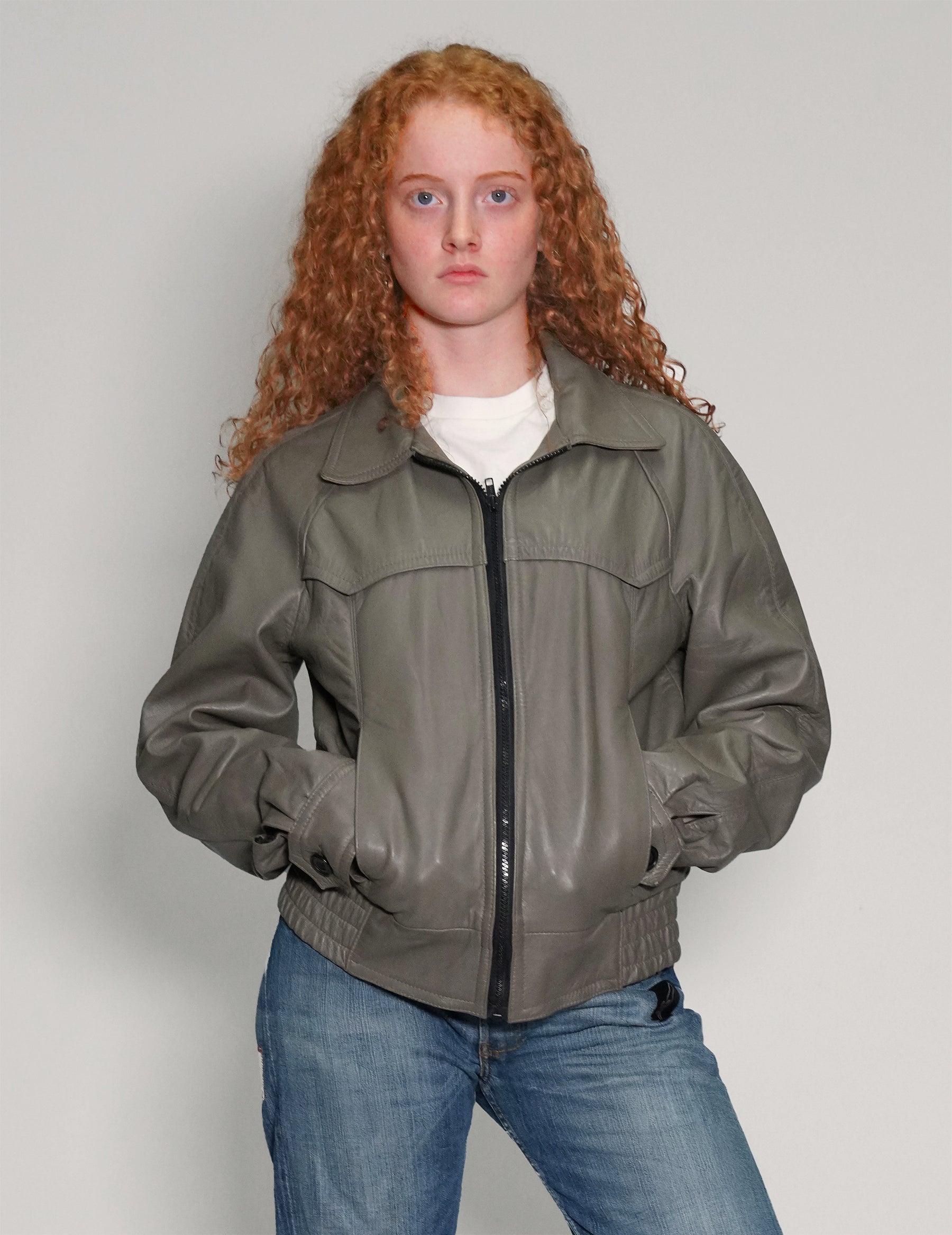 Vintage Vass Leather jacket in Light Grey. 100% Leather. Zip fastening front, inside breast pockets, slit waist pockets and button fastening cuffs. Beautifully soft leather, great for autumnal layering fits.
