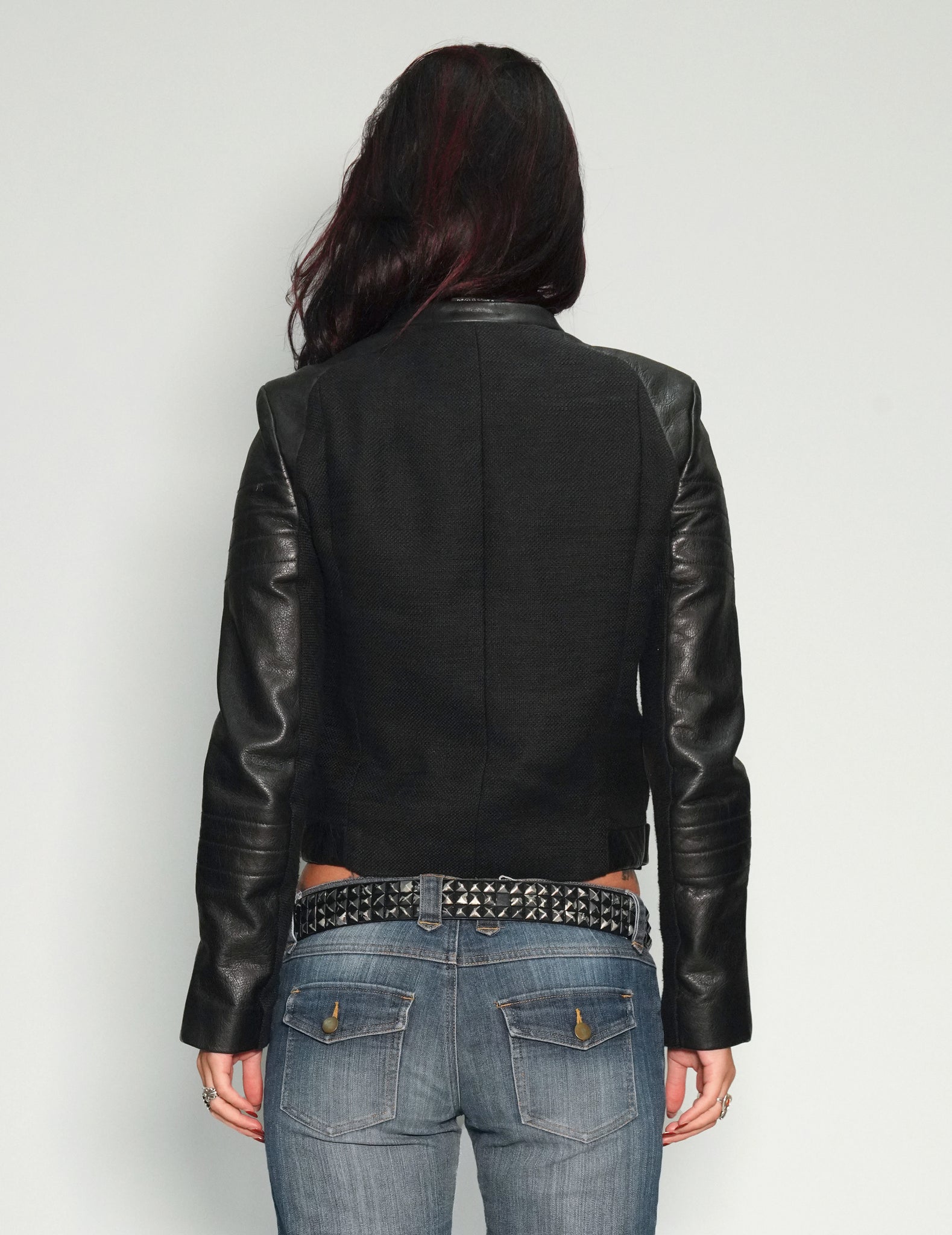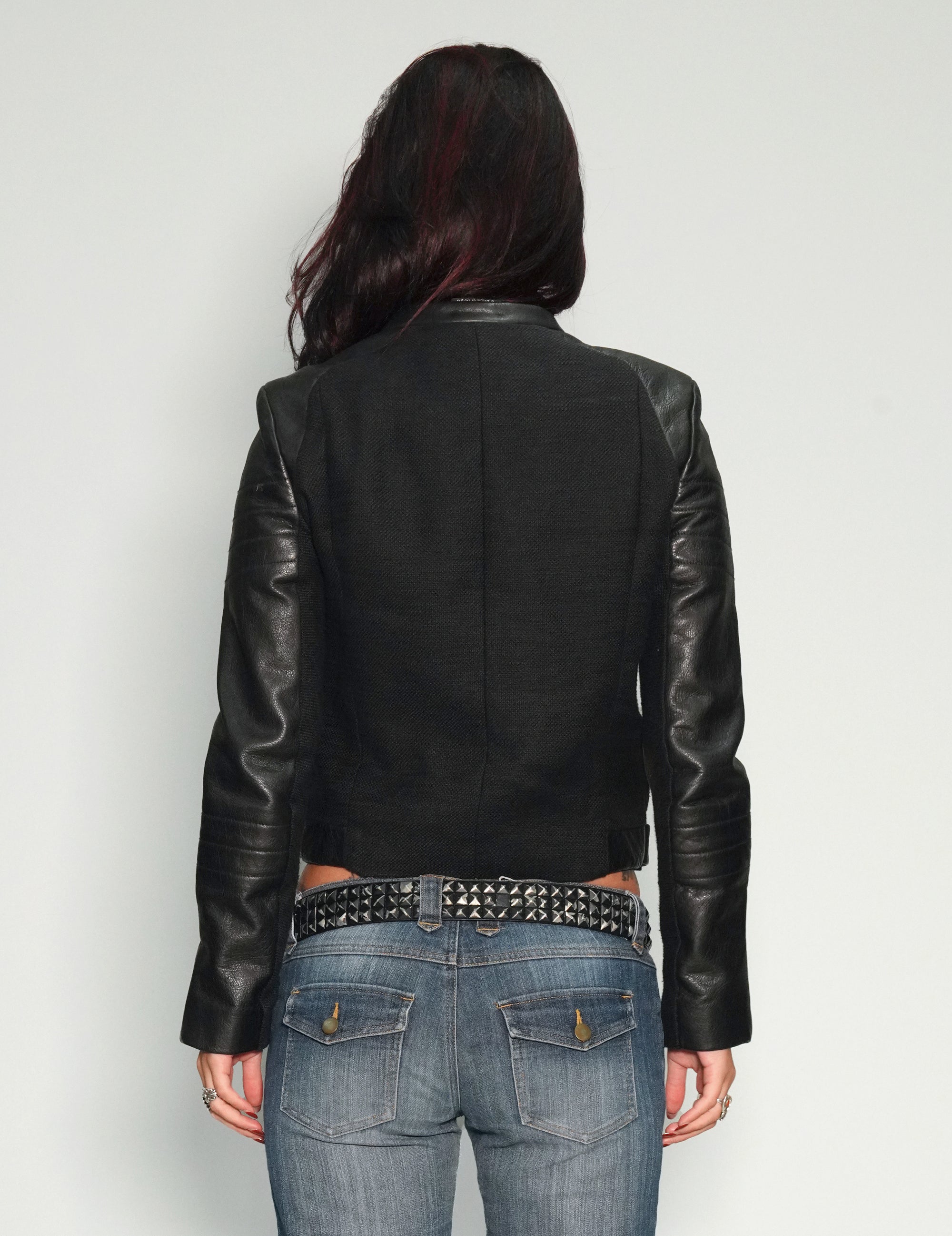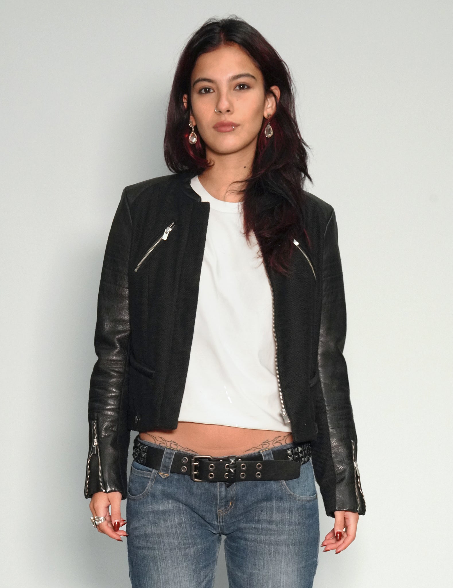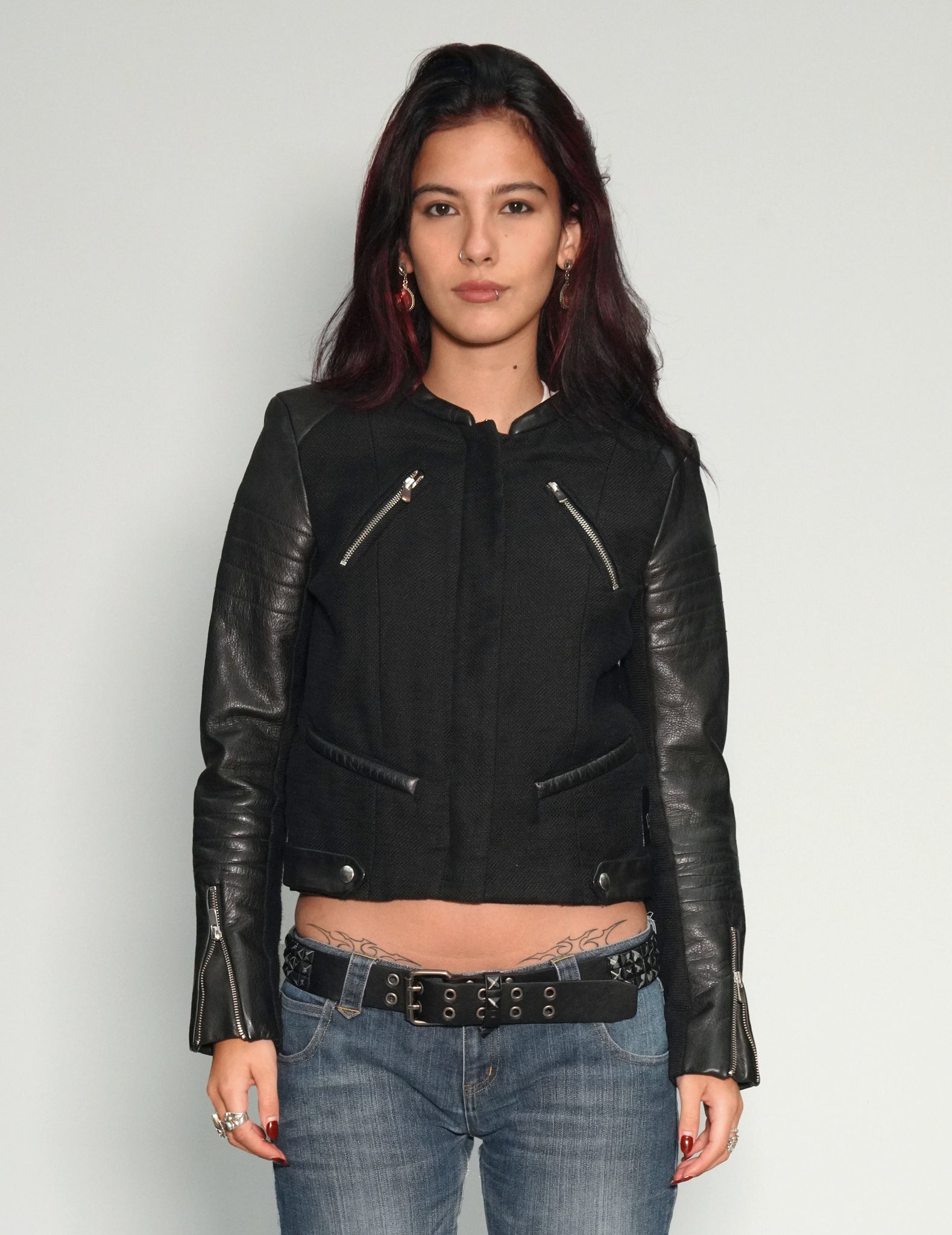 Vintage Maje womens biker jacket, 100% Wool, with leather sleeves. Featuring zip fastening front, zip breast pockets and zip cuffs.