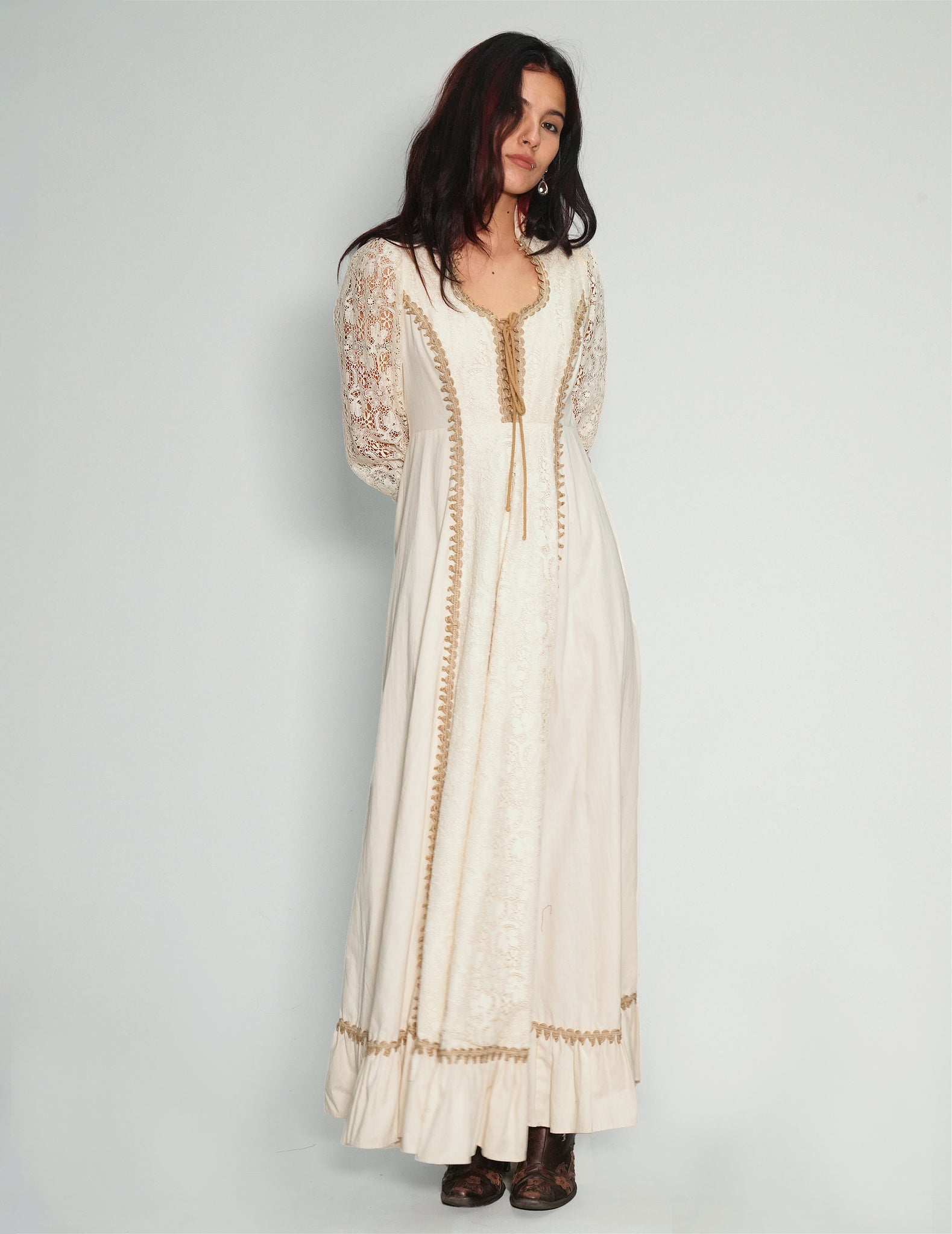 Beautiful vintage hippy-style 70s dress, 100% cotton. Features string tied front, zip fastening back and long flowing structure.