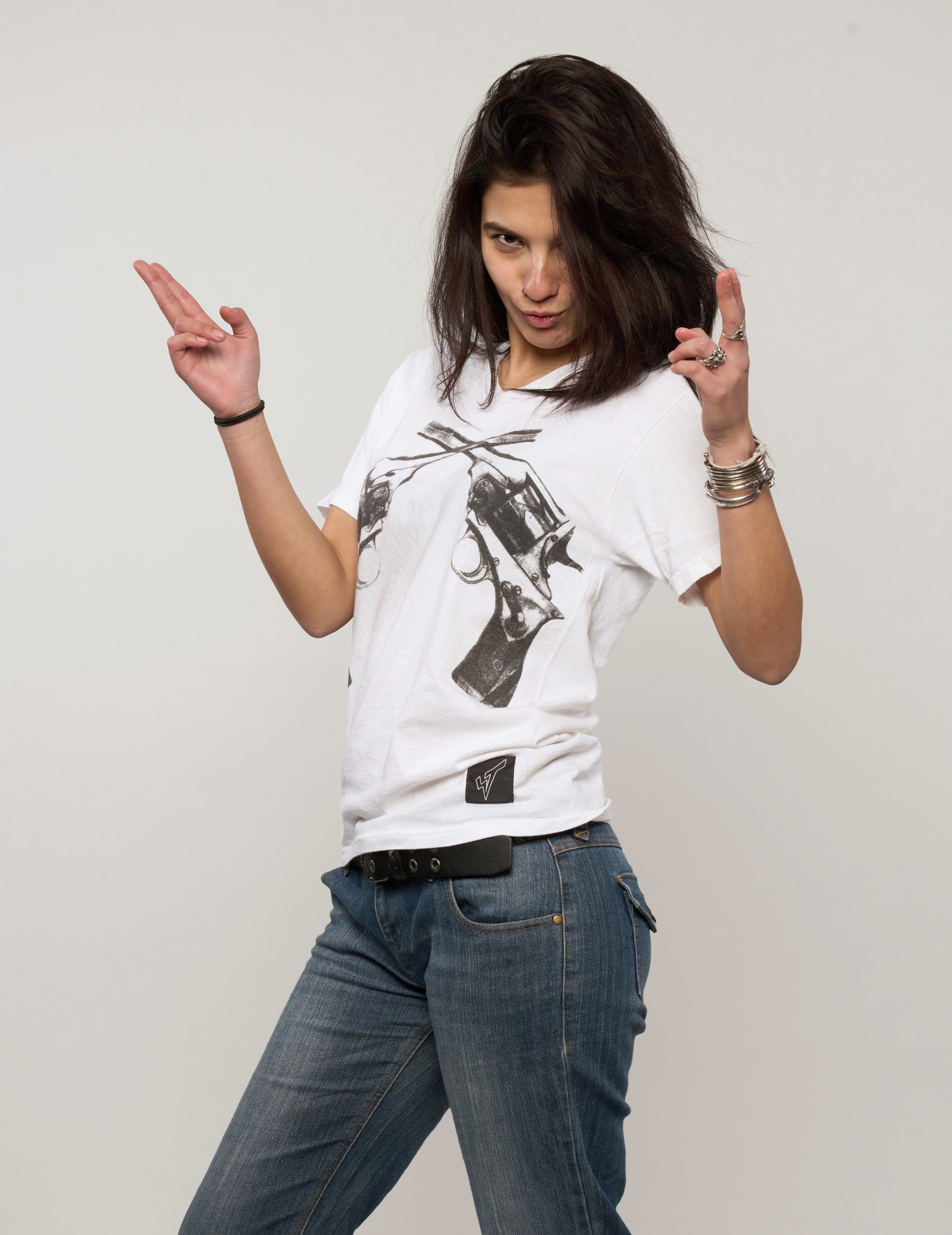 Deadstock white tees with our original Crossed Pistols print, a very Vivienne inspired print, hand screenprinted in our East London tailoring shop.