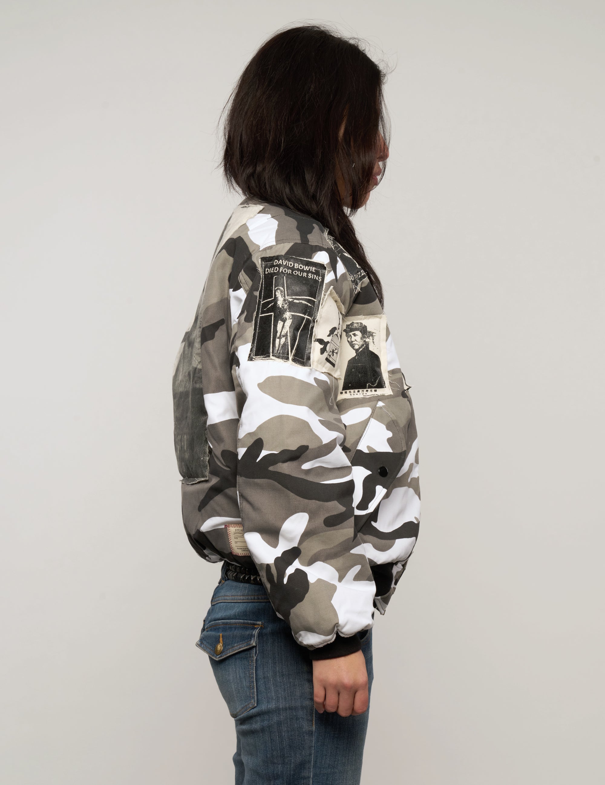 The classic MA-1 bomber jacket in arctic camo, originally designed for the U.S. Air Force and sourced and up-cycled from vintage military dead stock. Features signature ST custom screen printed patches of some of Stuart’s favourite decals and our favourite Rock n Roll icon mugshot on the back. This style is a reversible design with a bright orange lining with interior pockets, originally intended for emergency visibility.