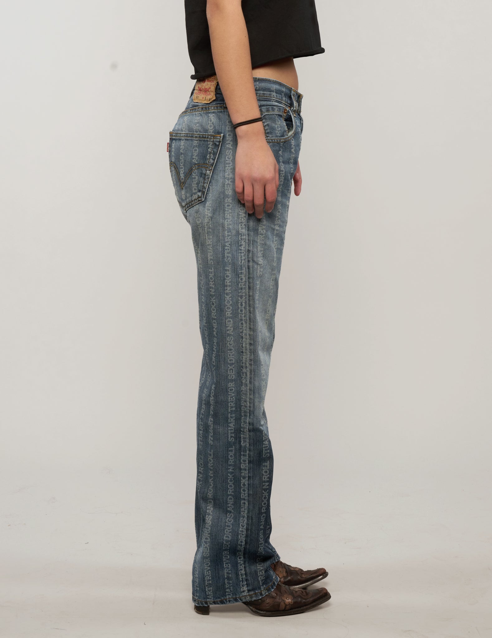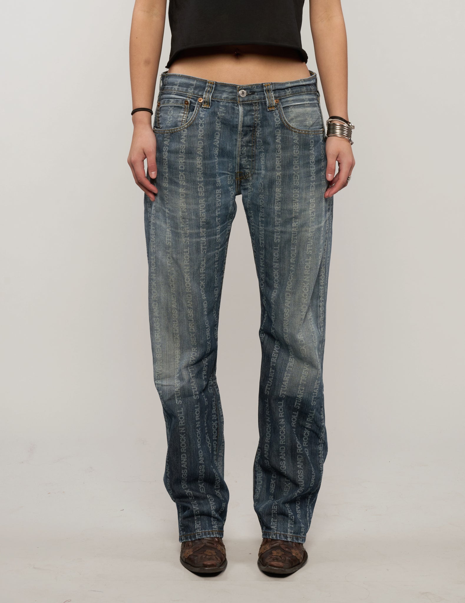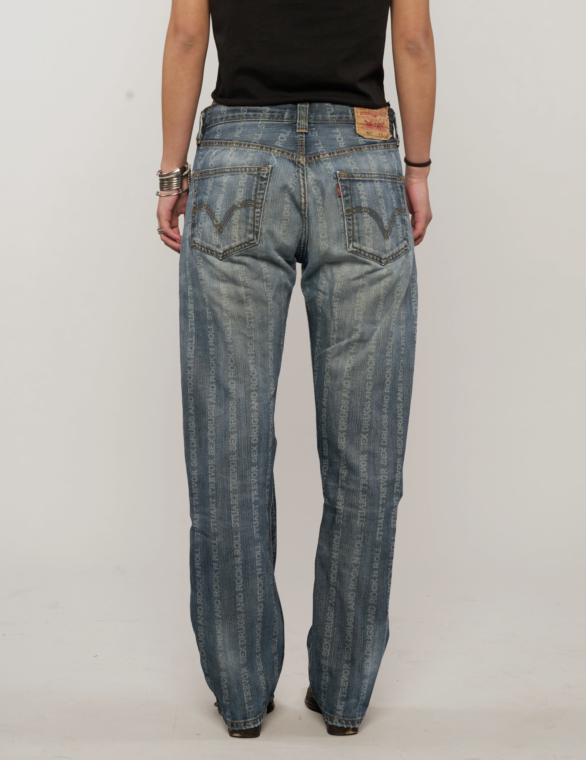 Vintage Levi's 501, laser engraved with 'S'x D'ugs Rock n Roll' and Stuart Trevor branding. Each pair is super rare and laser engraved in our East London tailoring shop. All come with the finest detailing with ST logo and labelling, signed and dated with your name by Stuart himself.