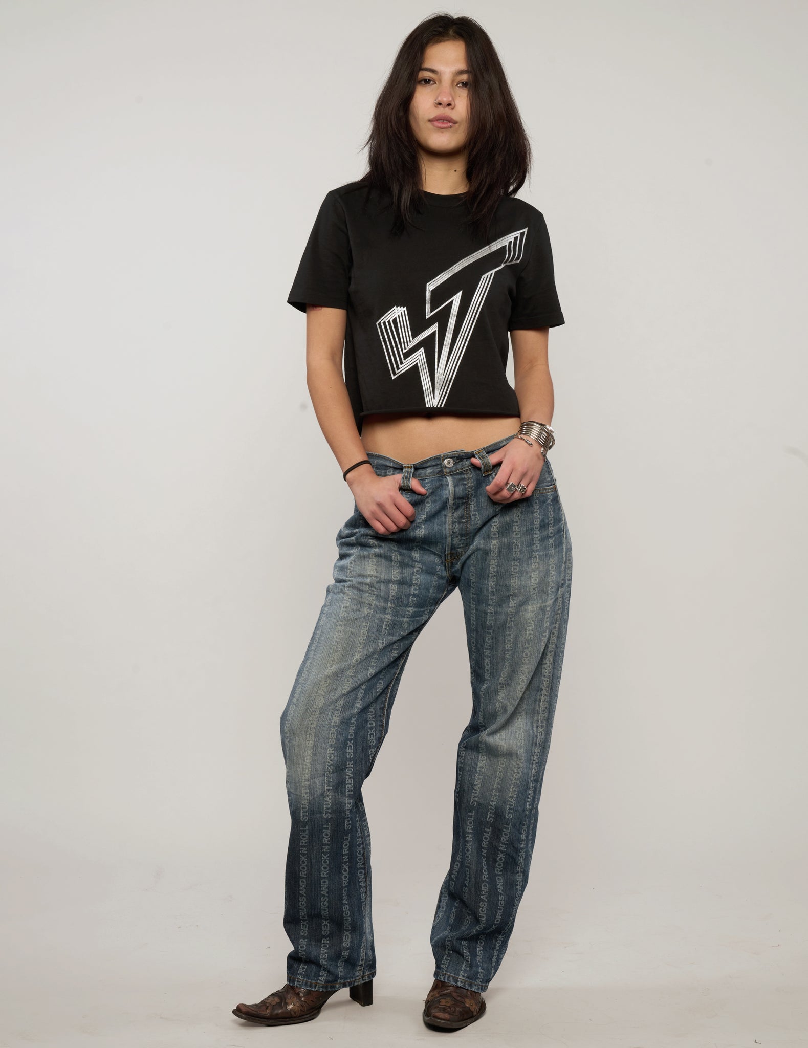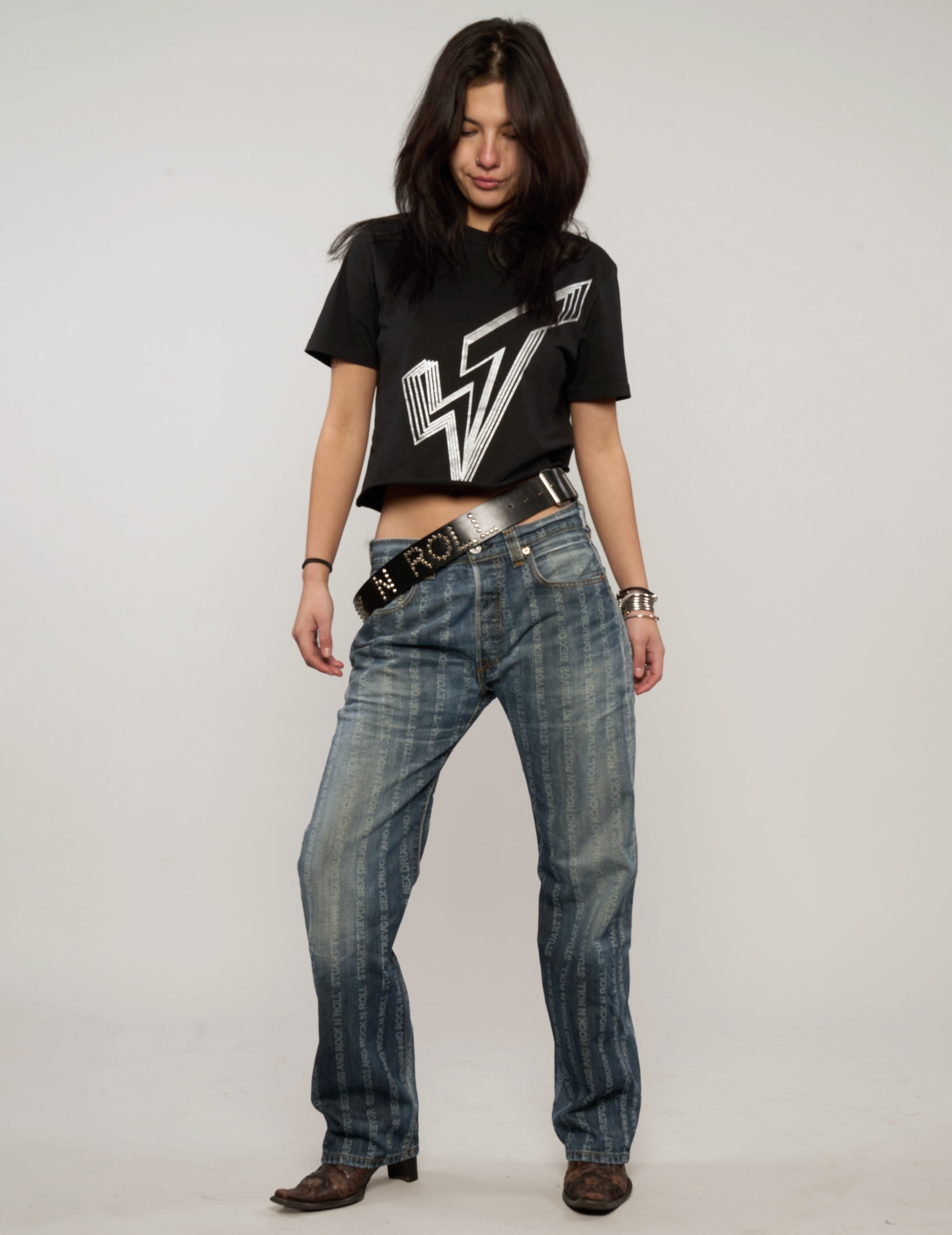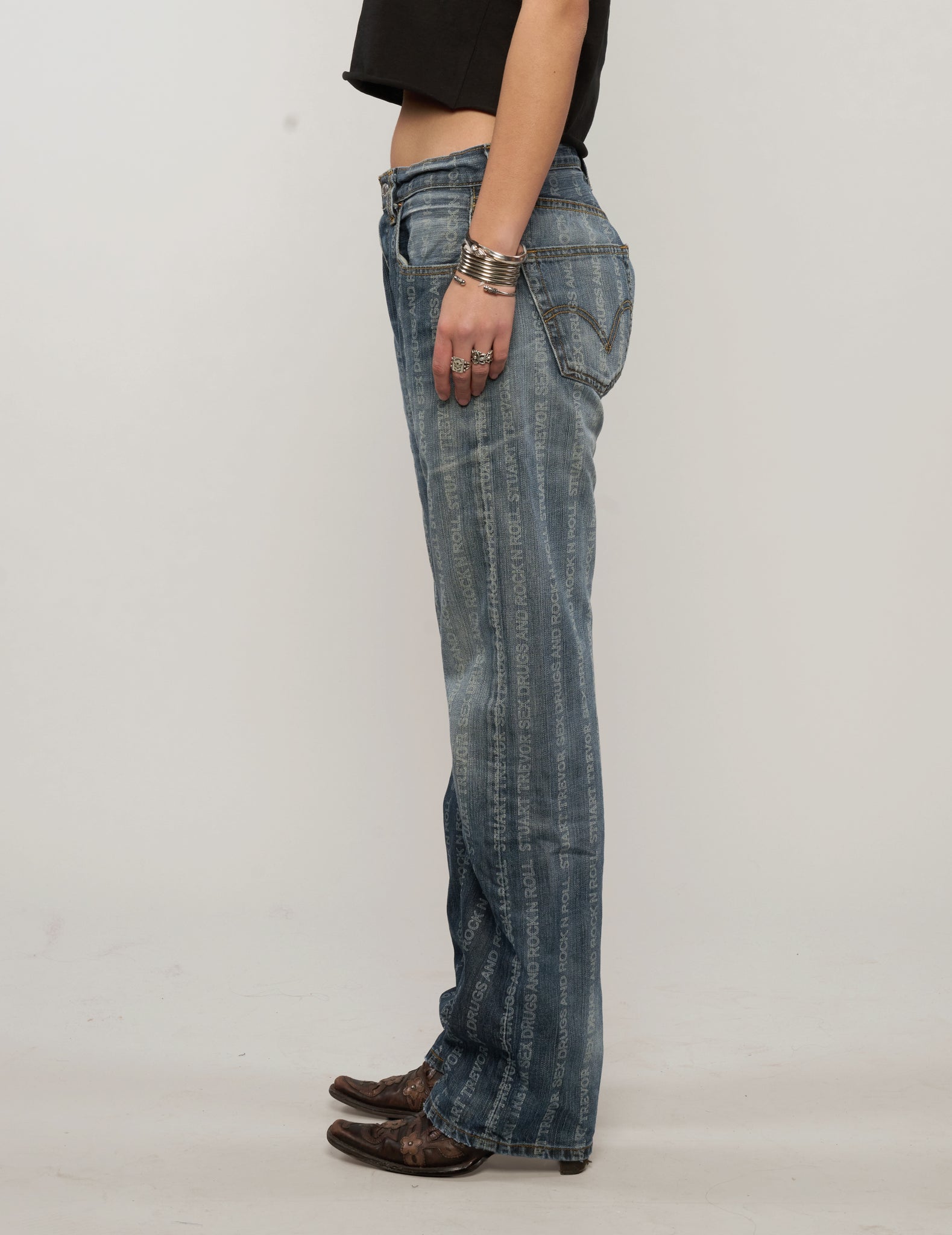Vintage Levi's 501, laser engraved with 'S'x D'ugs Rock n Roll' and Stuart Trevor branding. Each pair is super rare and laser engraved in our East London tailoring shop. All come with the finest detailing with ST logo and labelling, signed and dated with your name by Stuart himself.