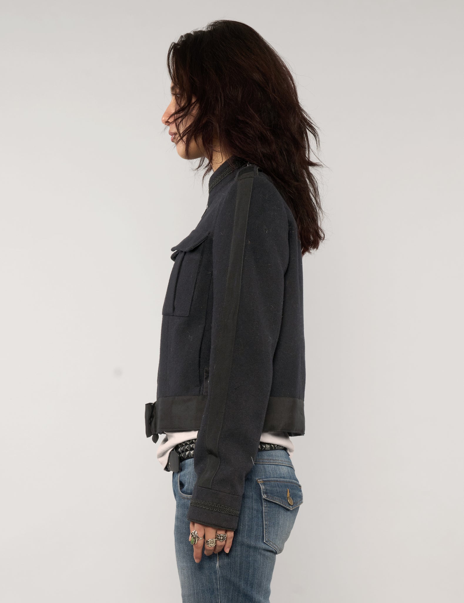 A fitted military style utility jacket with a refined, modern edge. Designed in a structured woollen mix black fabric, this style features a clean zip-front closure, flap chest pockets, and subtle seam detailing for a streamlined silhouette. The cropped length is finished with a waist belt and metal ring detail, adding a distinctive, hardware-led touch. Rooted in military influence with a confident rock-and-roll attitude, this jacket is made to stand out while remaining effortlessly wearable.
