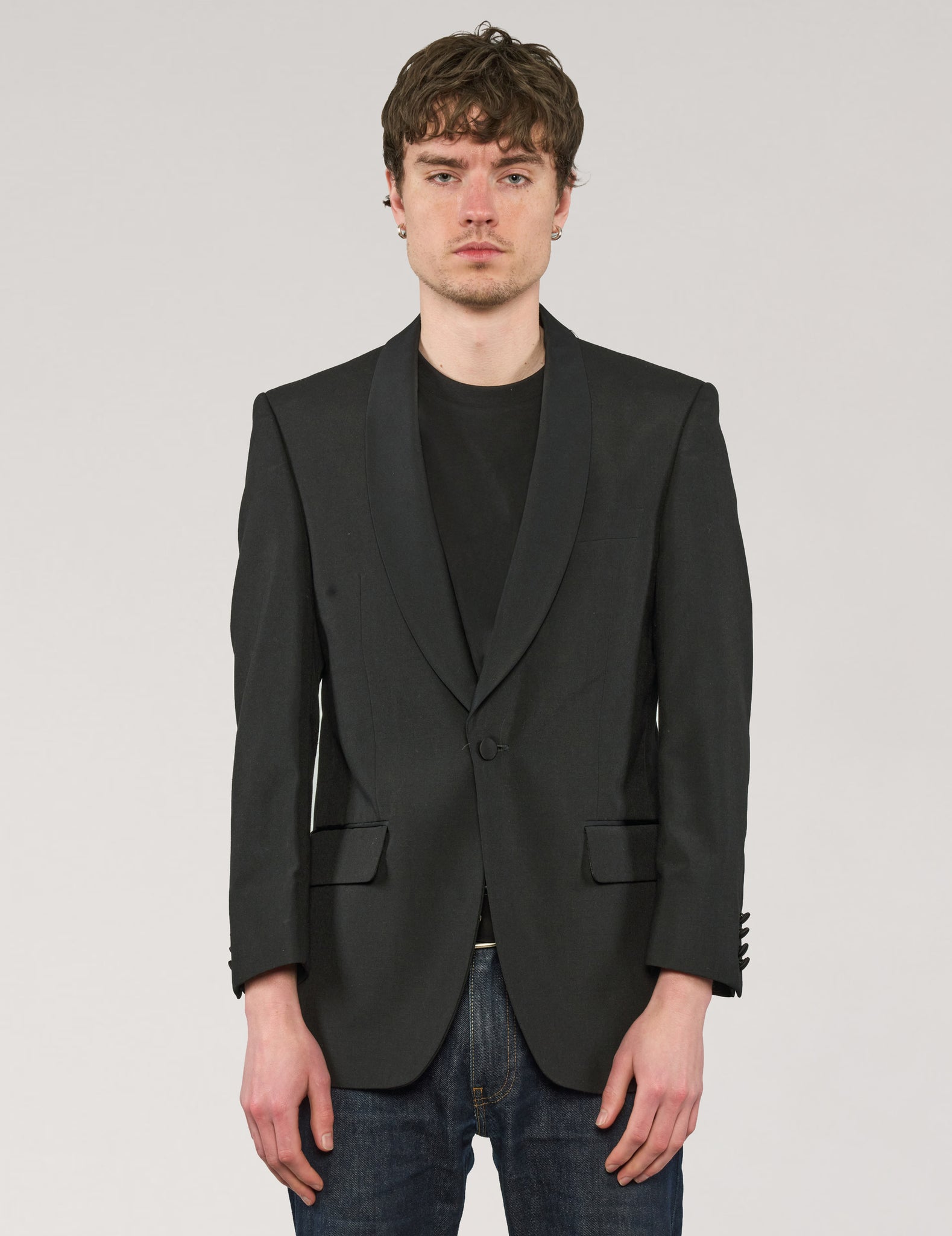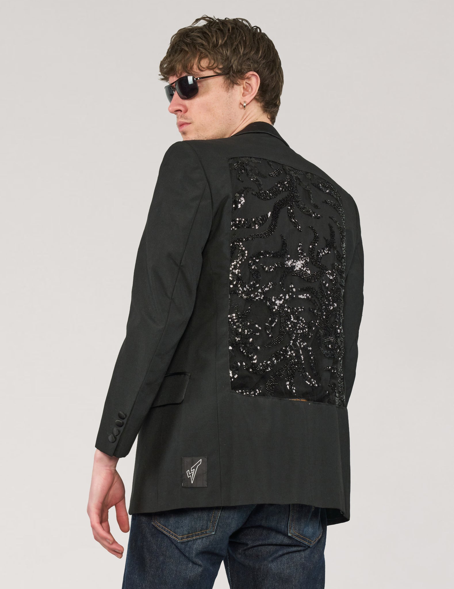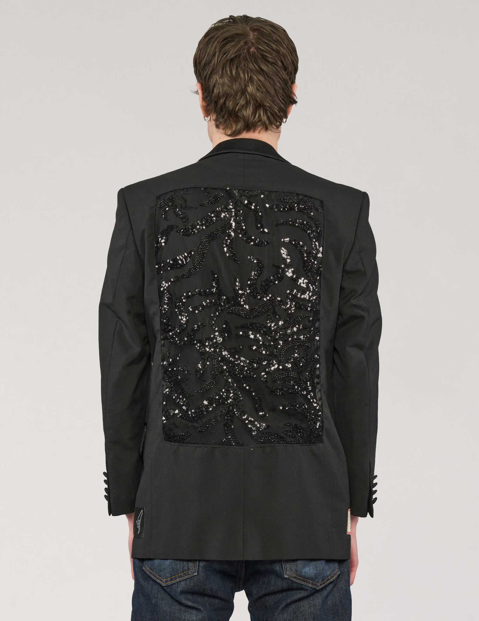 Vintage Tuxedo, customised with ST's iconic, sheer, black beaded sequin party back.