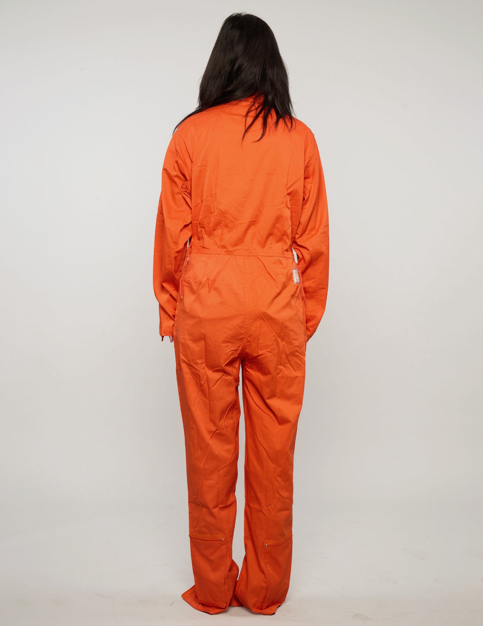 A modern take on the classic military jumpsuit with cut in structured orange cotton twill fabric. Designed with a streamlined zip-front closure and pockets and ankles, Side tabs define the waist, Finished with adjustable zip detailing at the ankles for versatile styling over boots or worn tapered. Add a STUART TREVOR studded belt for that rock-and-roll edge.