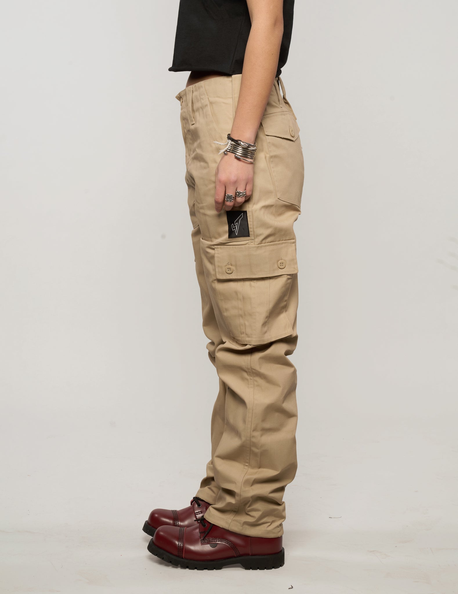 Deadstock, military cargo trousers in tan. Features side adjustable tabs, cargo pockets on both legs and zip fastened crotch. 65% Polyester 35% Cotton.