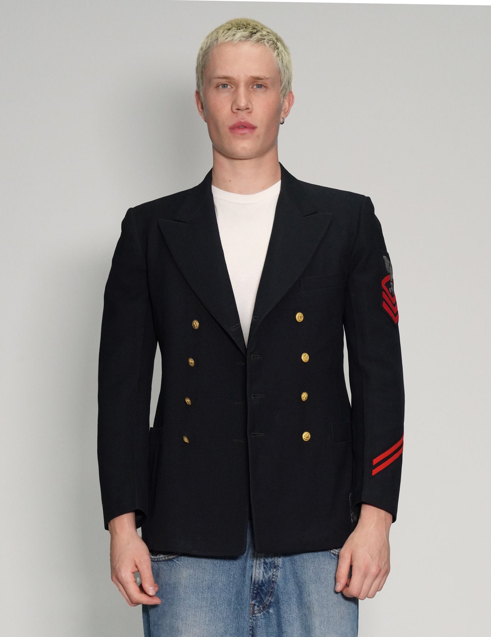 Vintage US Navy officers double breasted blazer, circa 1970s. Metal rank badge on left arm, and rank on sleeve. 8 Button fastening front, 100% Wool. Inside breast pockets, and hip patch pockets.