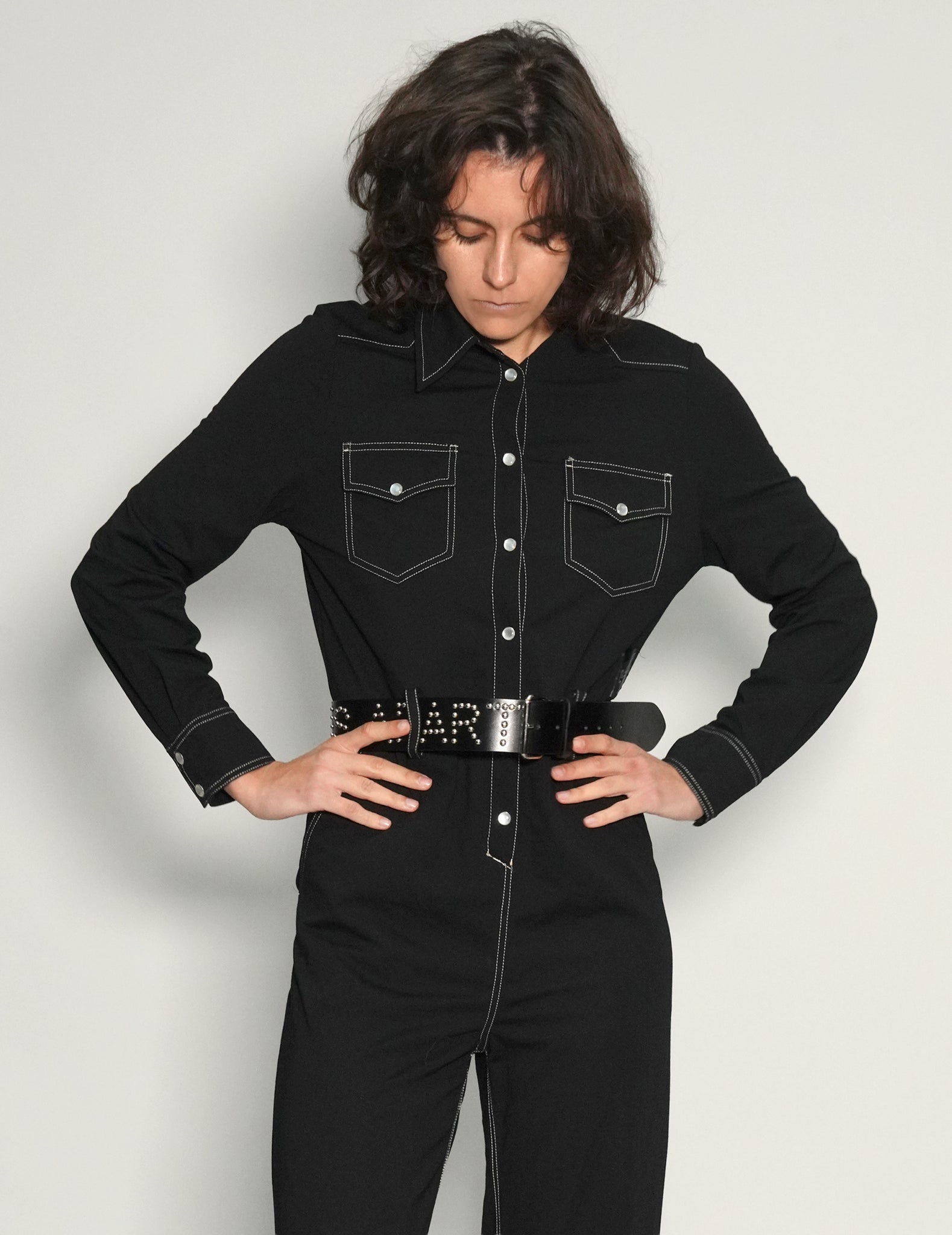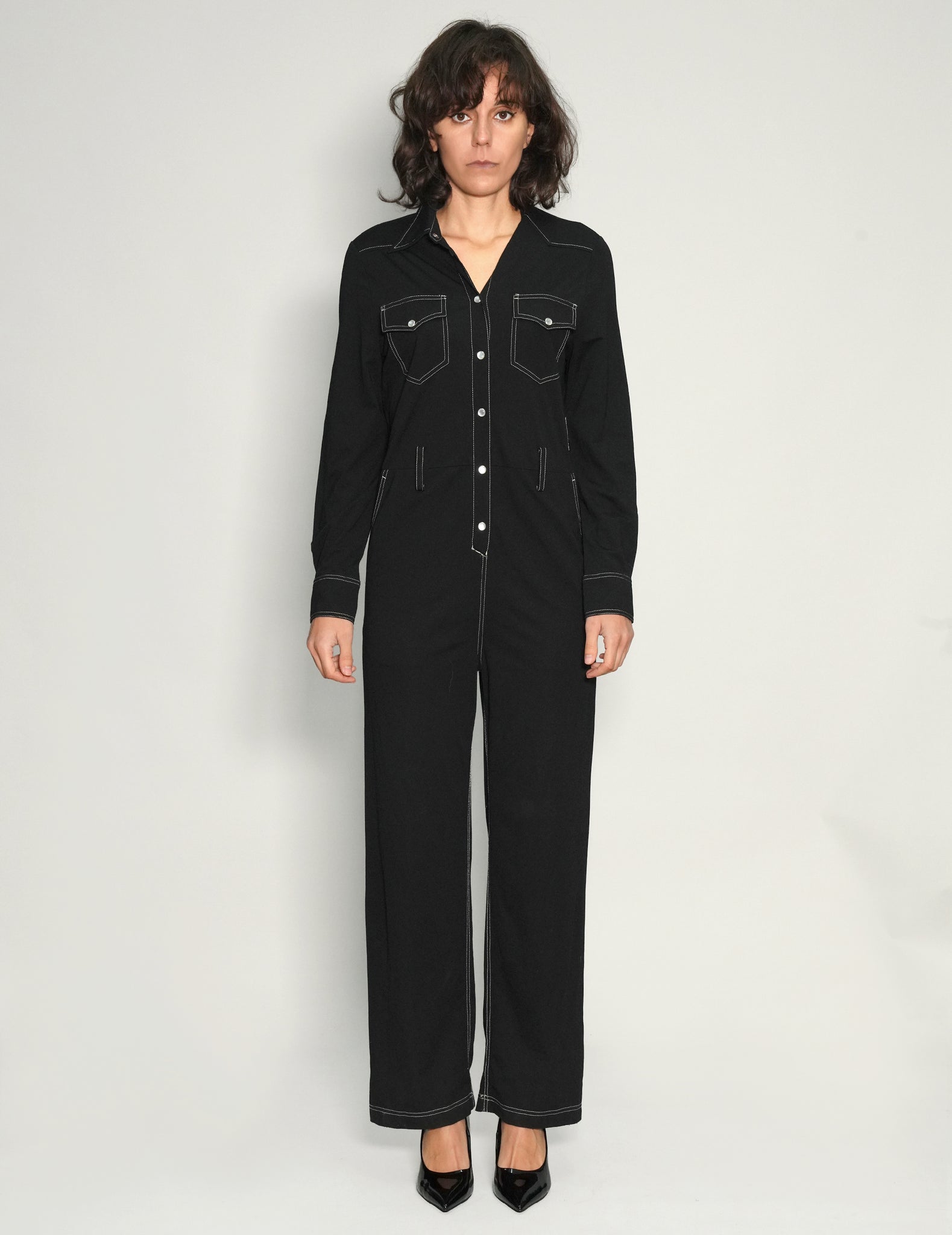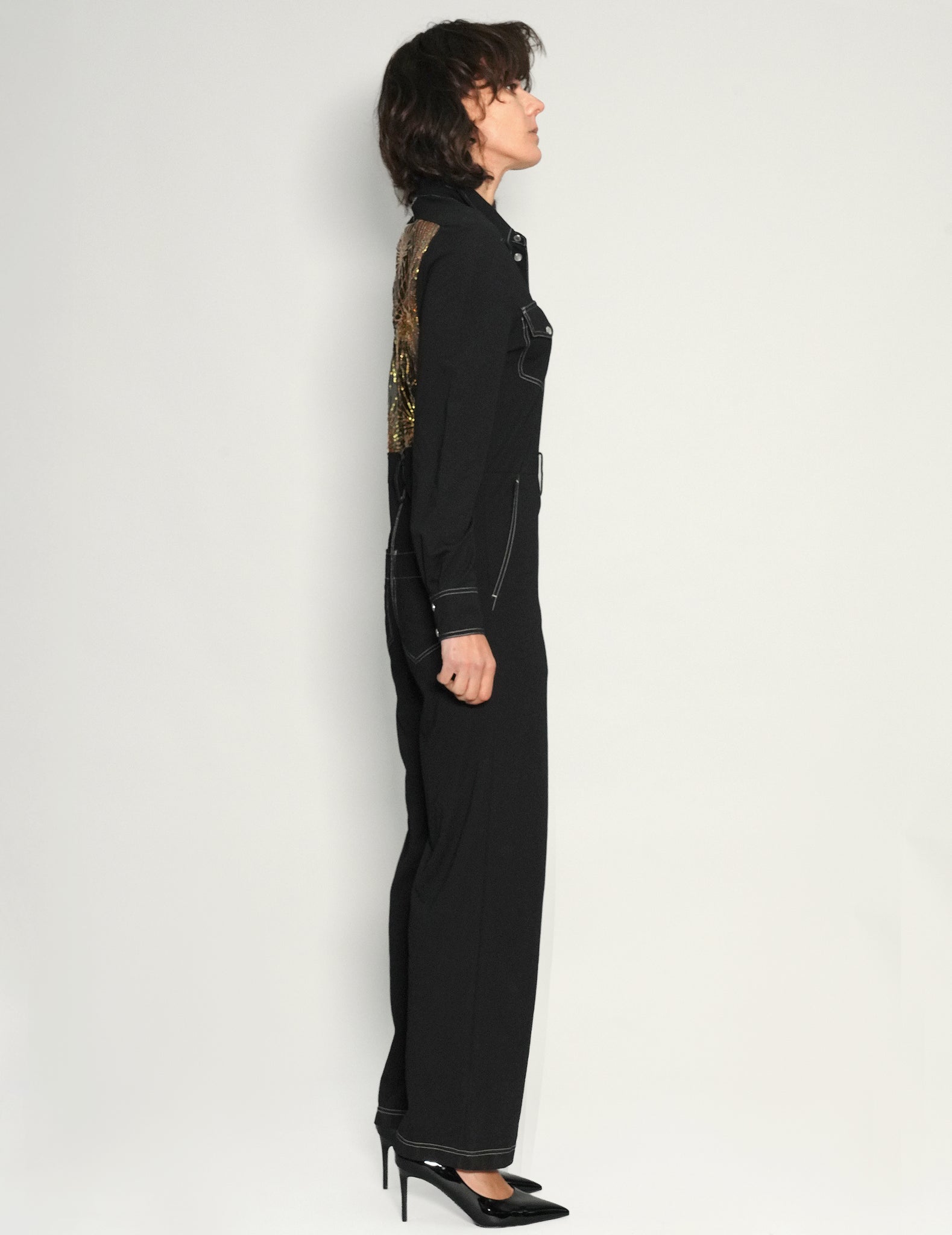 One off, black jumpsuit, 100% cotton, featuring the ST signature gold sequin, art-deco style sheer back panel.