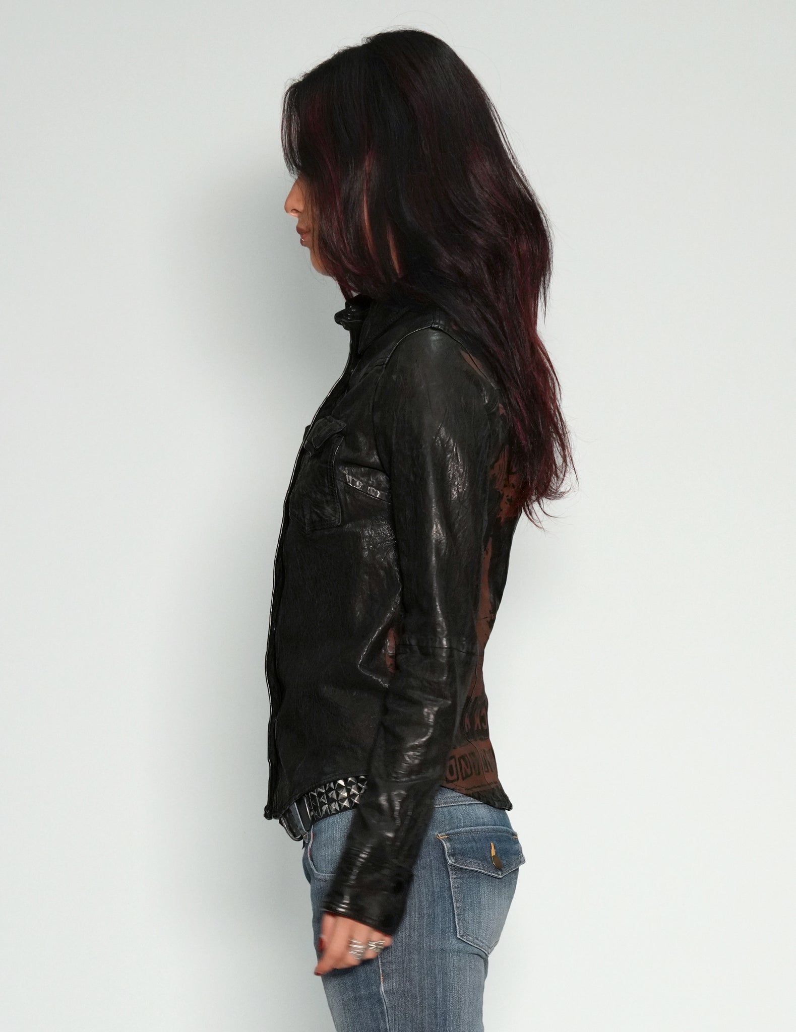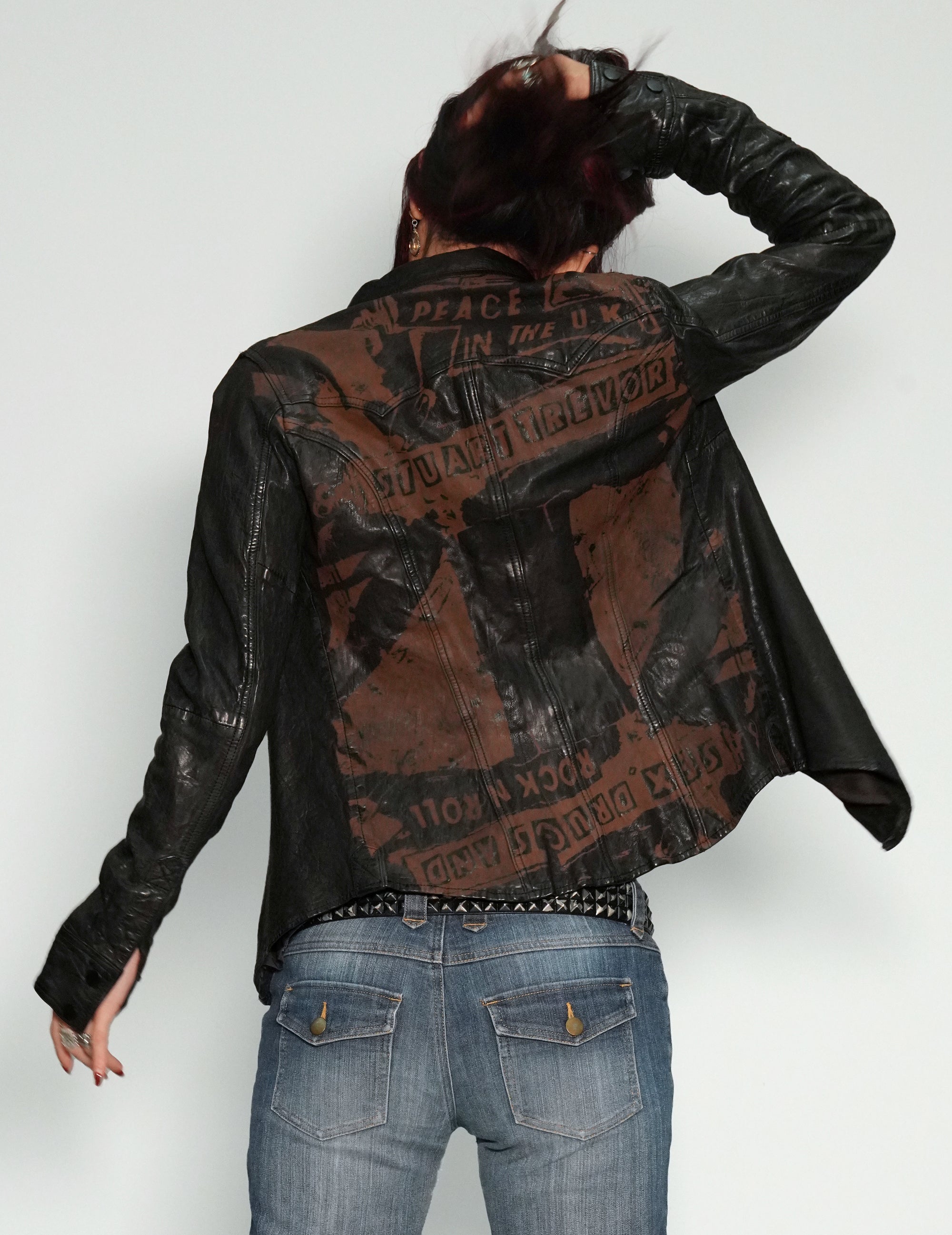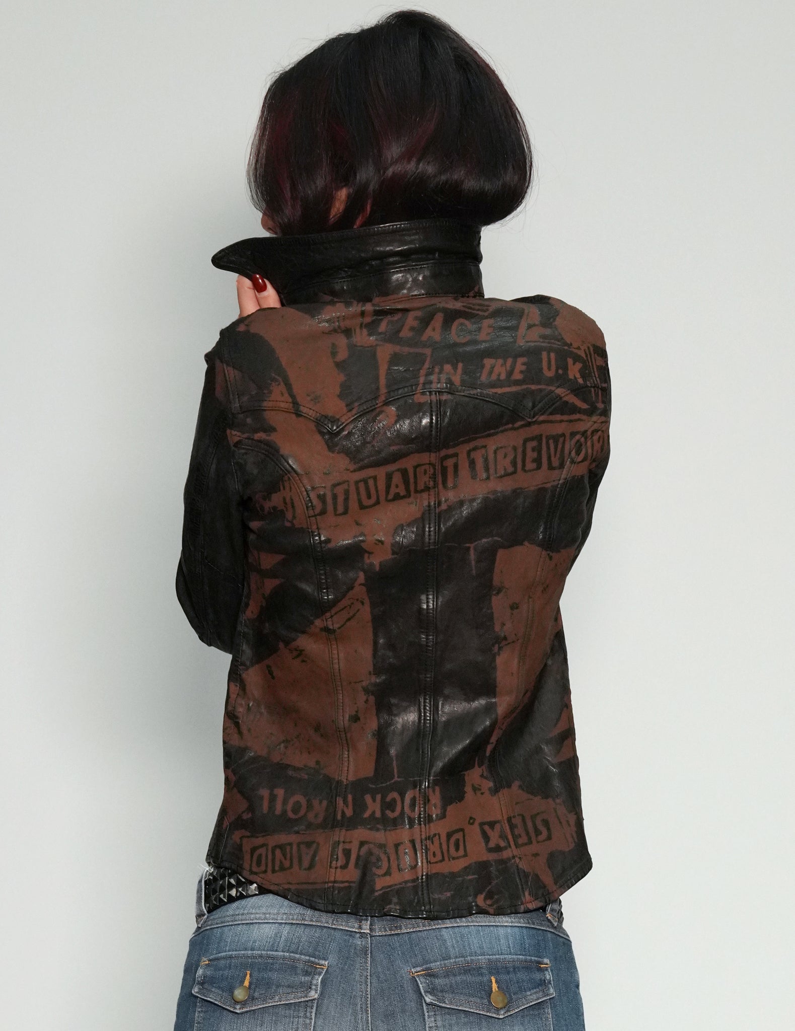 Original IMMORTAL leather laser printed in our East London tailoring shop, with our Iconic original graphic print with "Stuart Trevor, Peace in the UK, Anarchy in the World and S'x D'ugs n Rock n Roll" on the back.