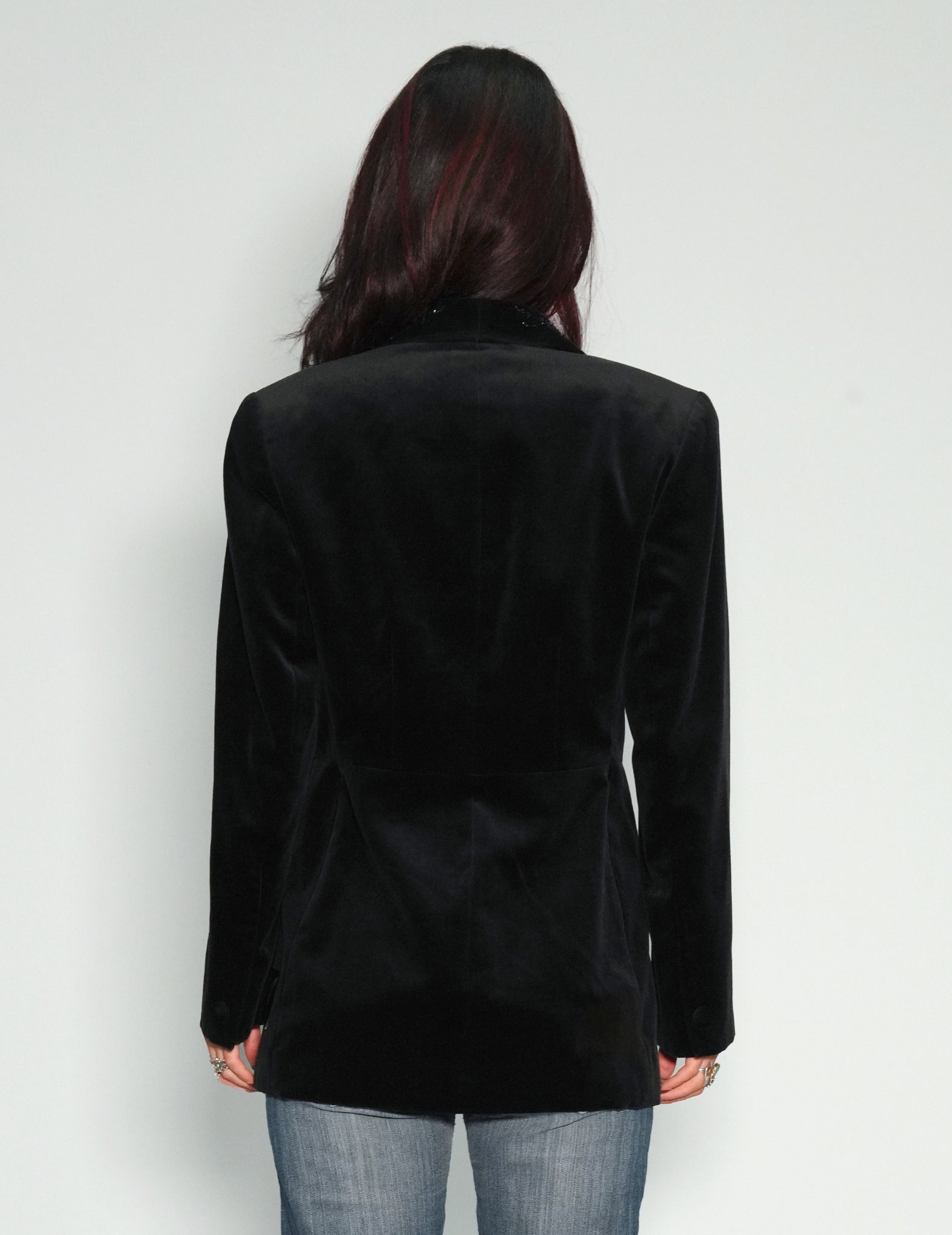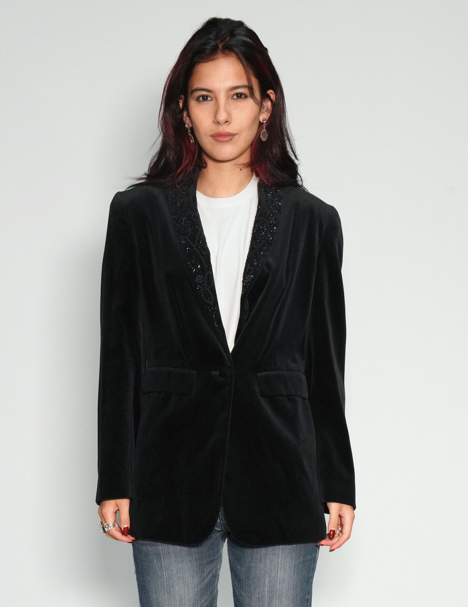 Vintage Laura Ashley velvet blazer, circa 90's, with intricate beading on collar in an art deco style. Flap pockets on hip and single button fastening front.