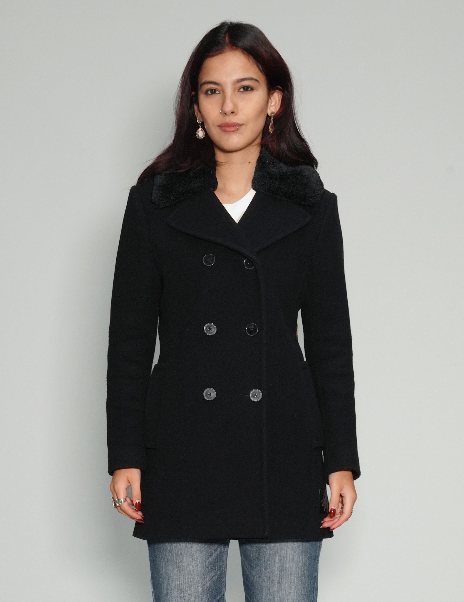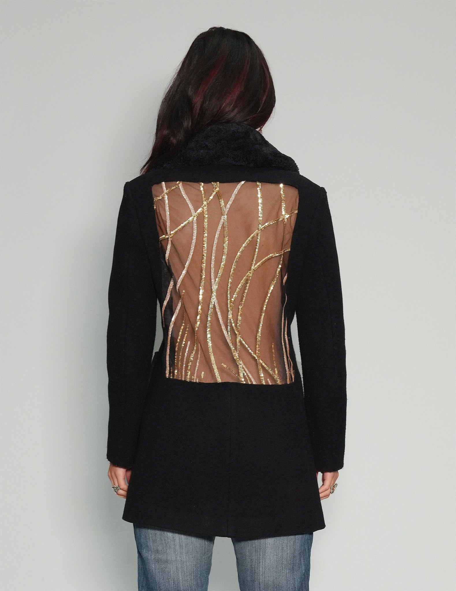 Women's vintage black button up blazer jacket with fur collar, customised with our signature ST gold sequin, art-deco style sheer back panel. Model is 5'8 wearing a size M.