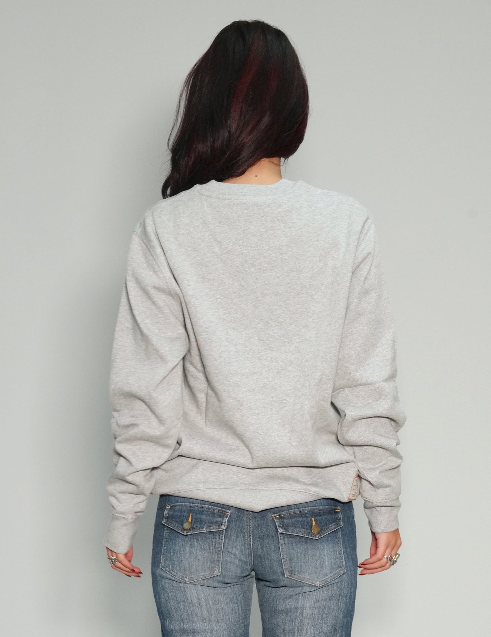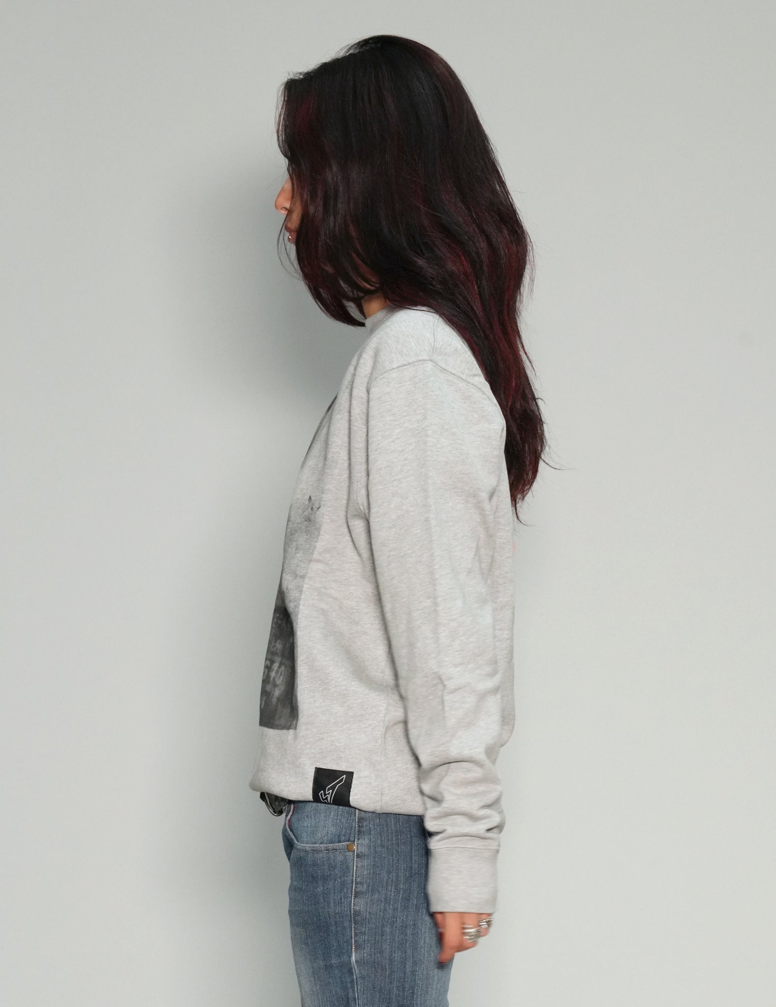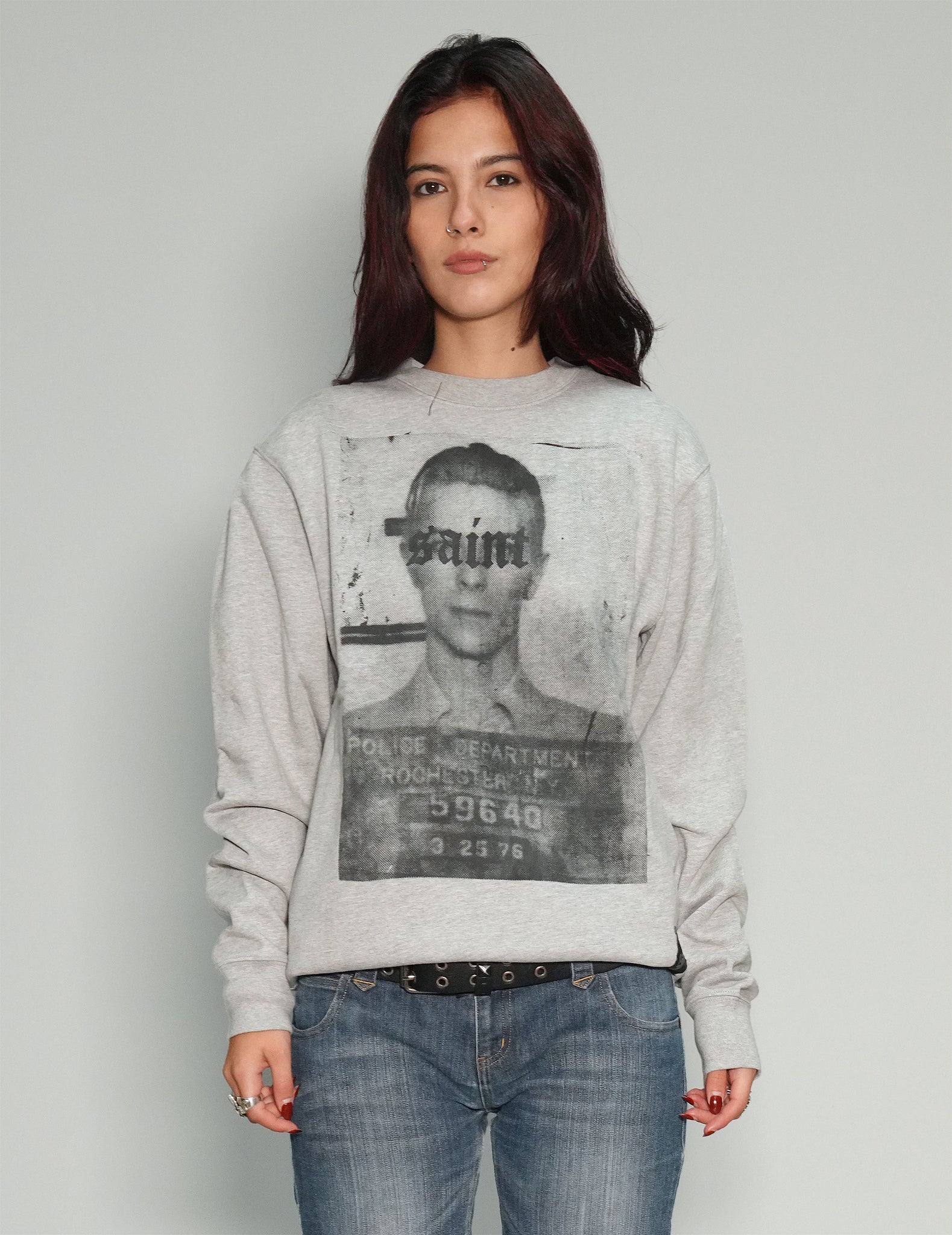 Women's grey sweatshirt crafted from 100% GOTS certified recycled cotton made from in-house organic cutting waste, features Bowie inspired mugshot print on the front, 1x1 rib at collar, hem and cuffs.