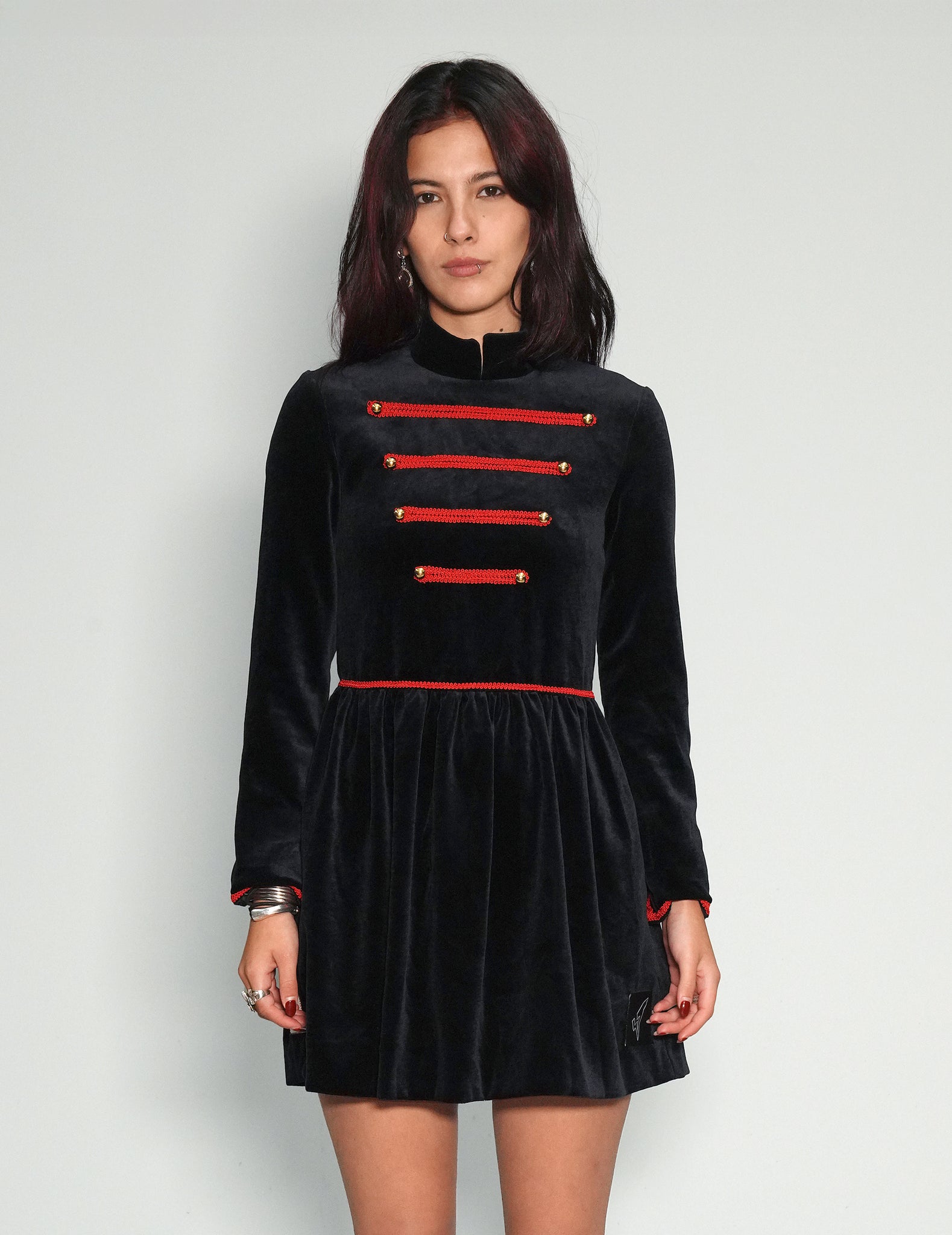 Vintage Marching Band-style velvet dress. 100% Merino wool. With lace front strips, much like Napoleonic style uniforms. Model is 5'8" wearing size 8