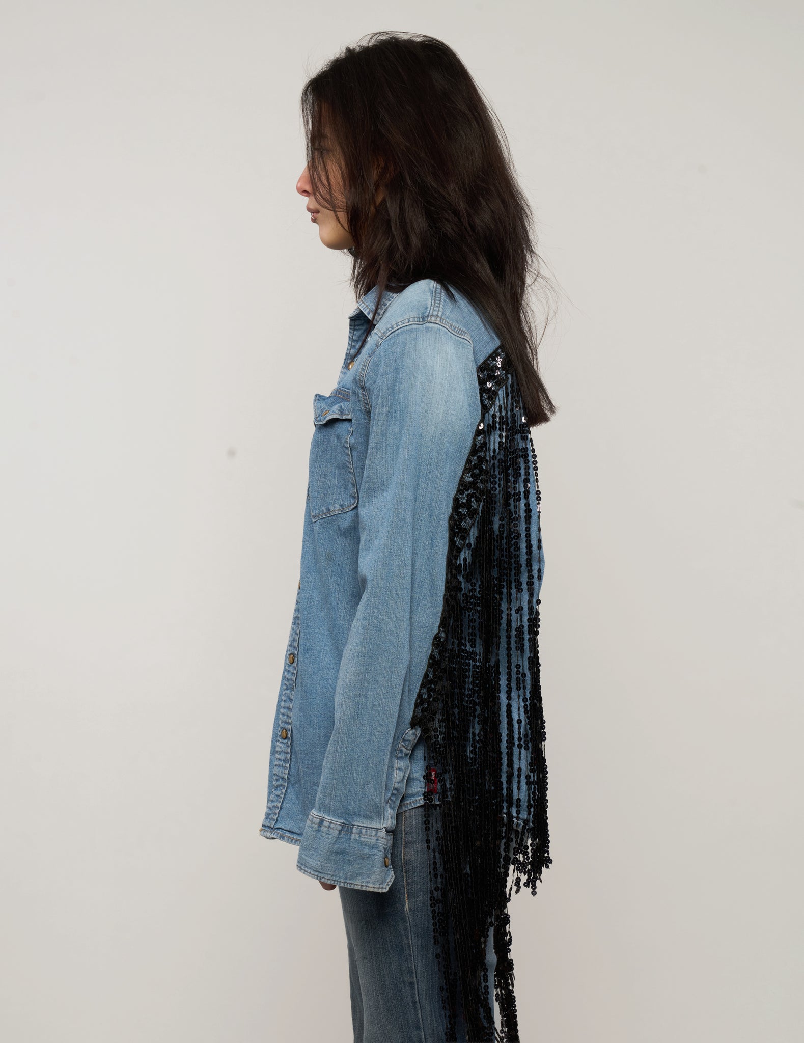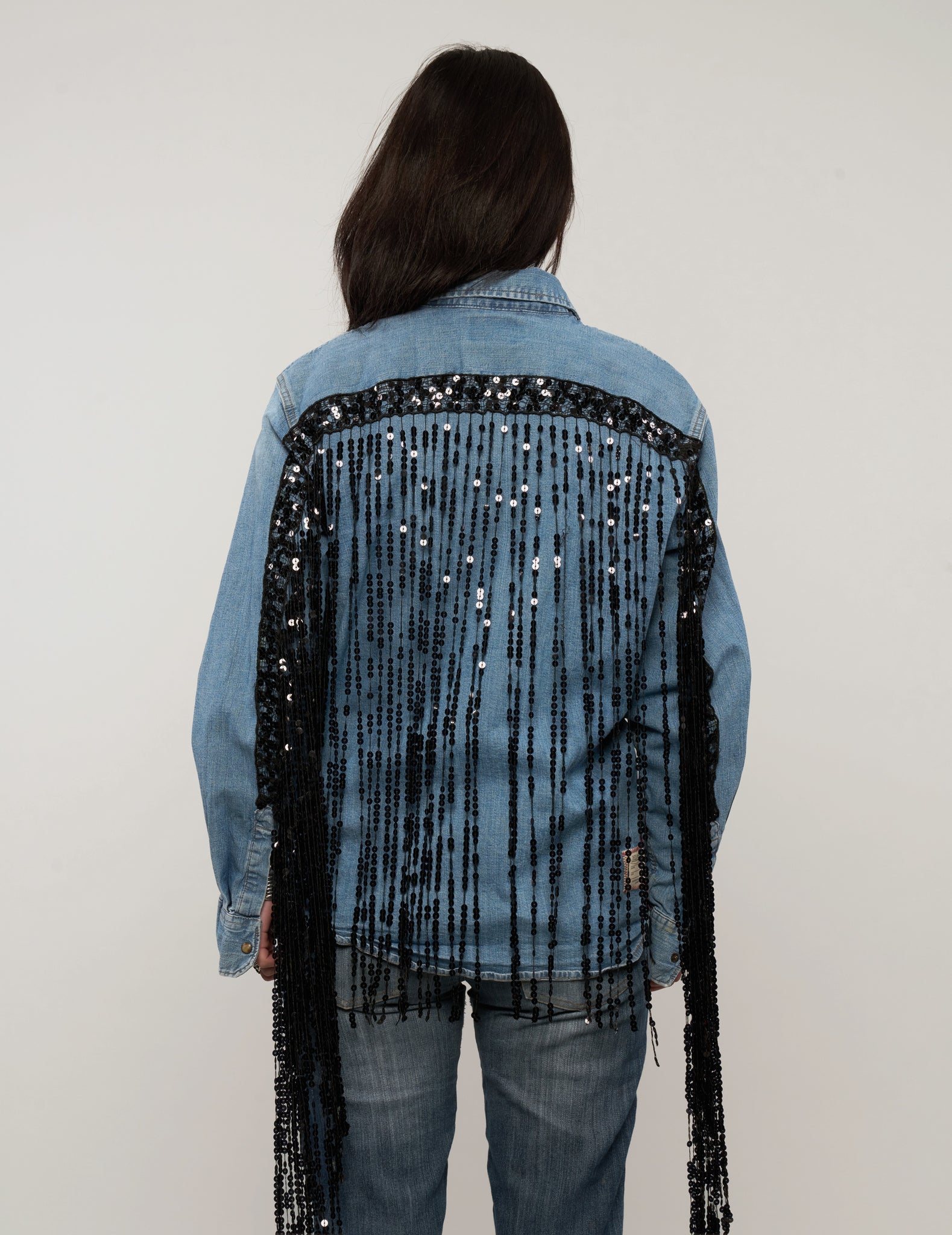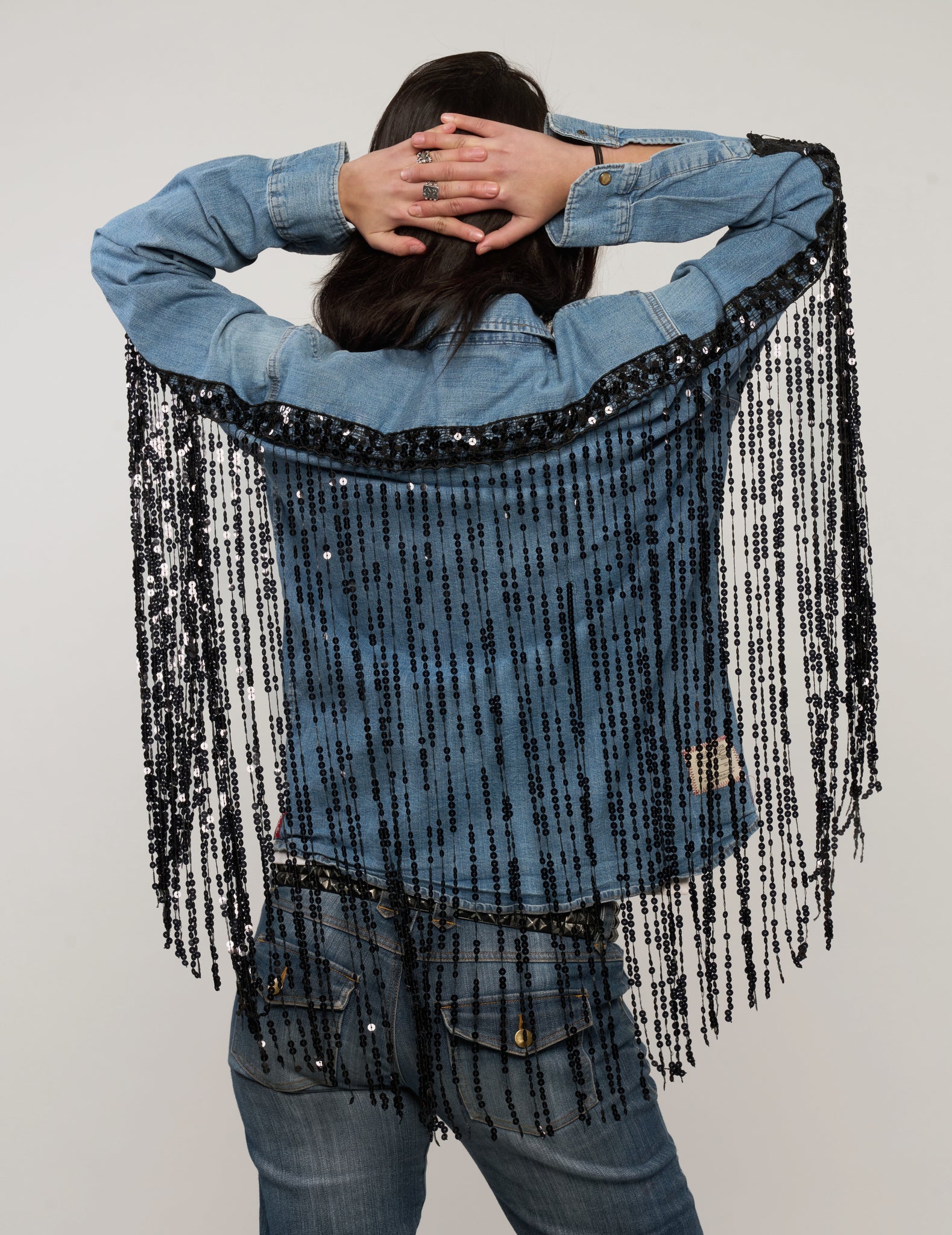 Vintage denim shirt, customised with long flowing sequinned tassels along the back of the shoulders. Features double breast pockets, adjustable cuffs and button fastened front. Perfect for the festival season.