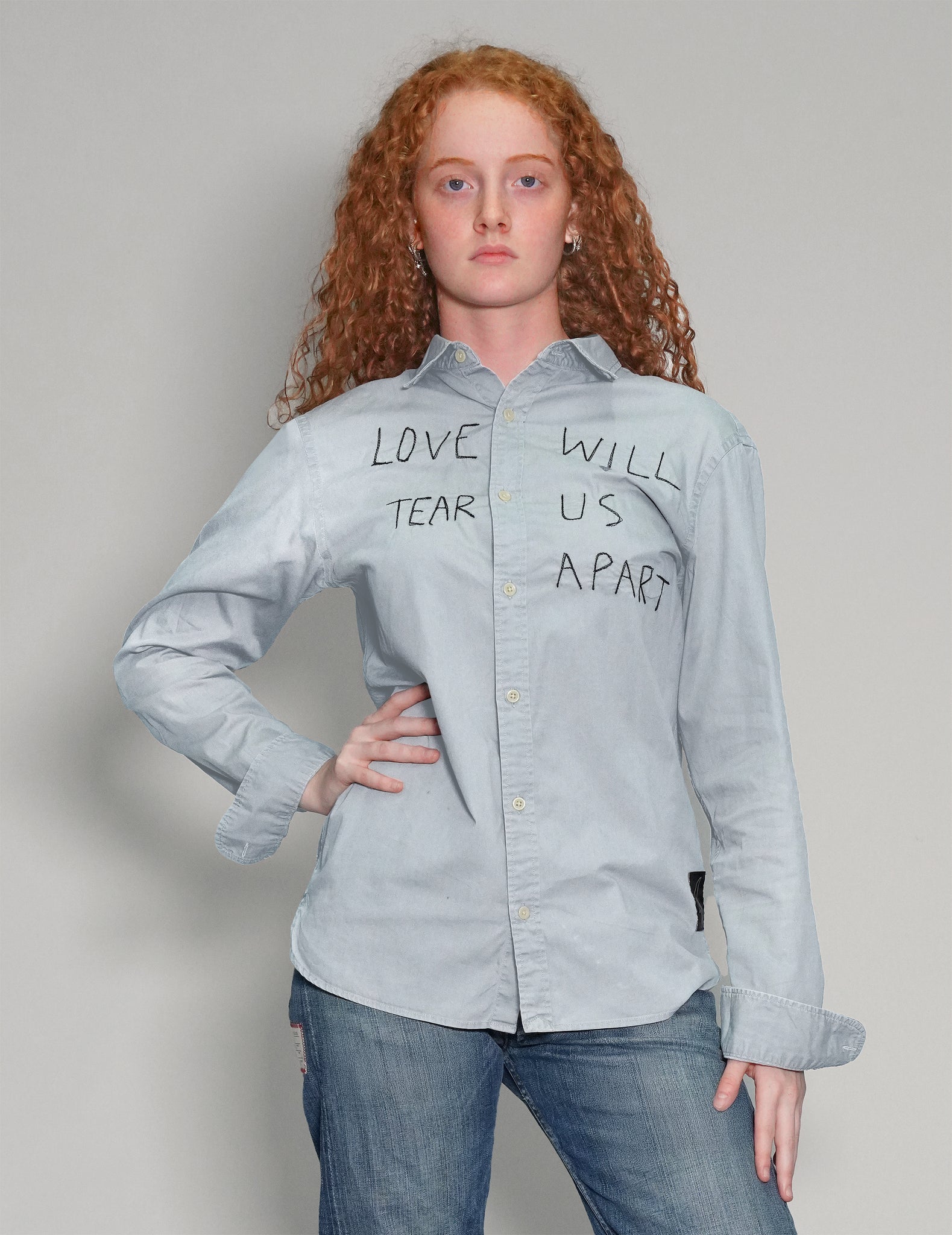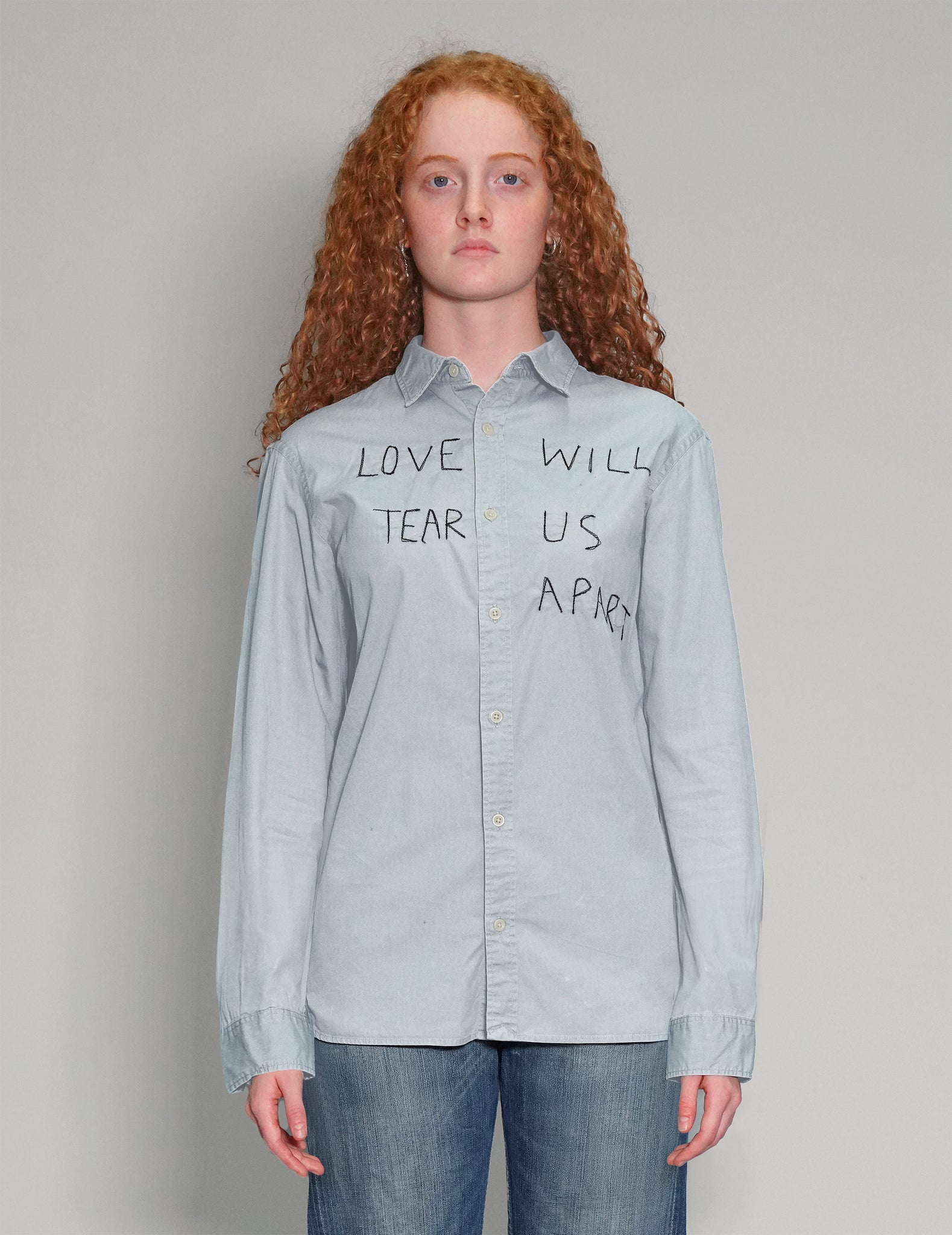 Classic light blue collared shirt, slim fit, customised with "Love Will Tear Us Apart" embroidery. 100% cotton.