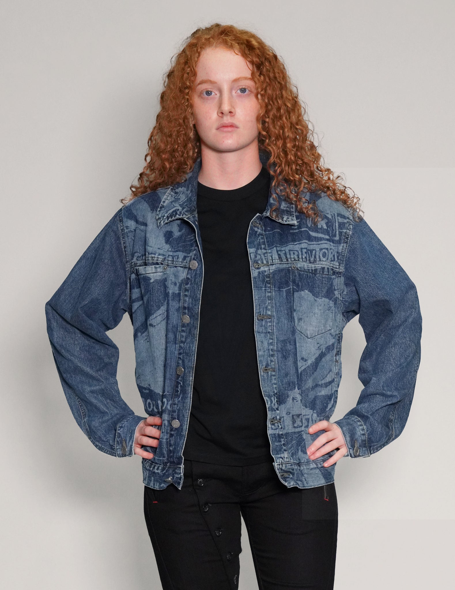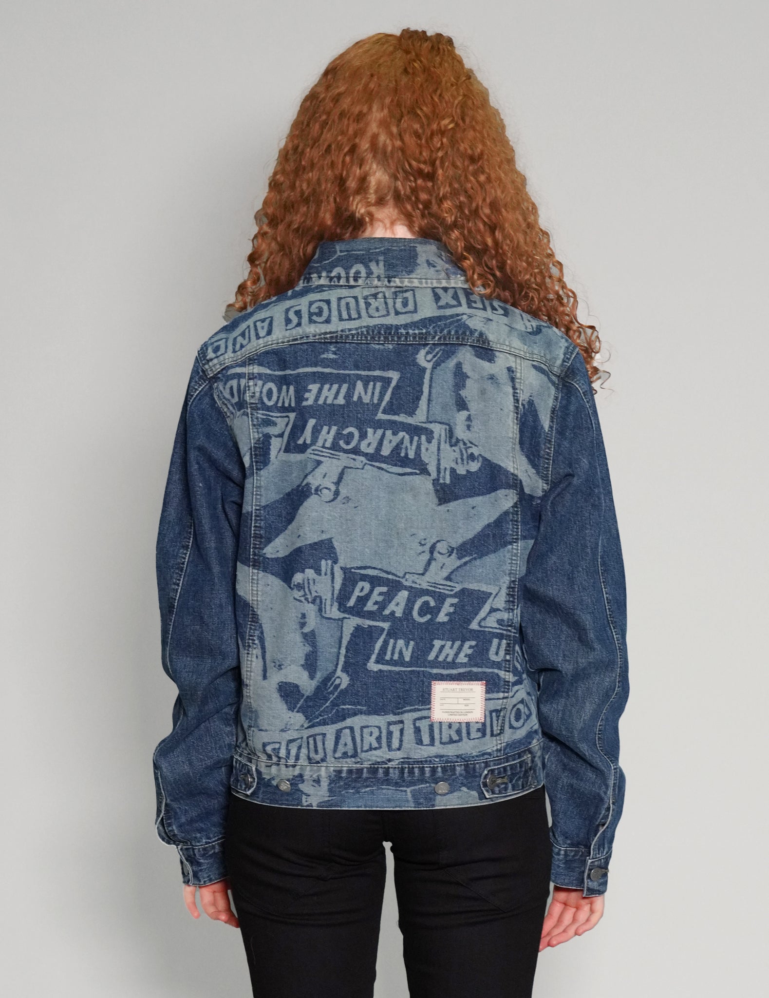 'Peace' print, vintage denim jacket. Each piece is super rare and laser printed in our East London tailoring shop. Features our original graphic print with "Stuart Trevor, Peace in the UK, Anarchy in the World and S'x D'ugs and Rock n Roll".