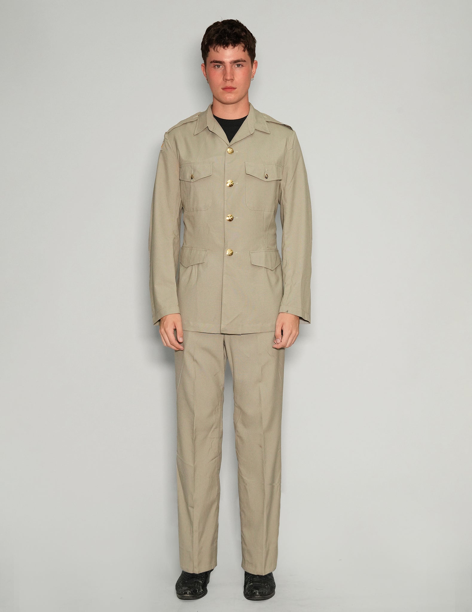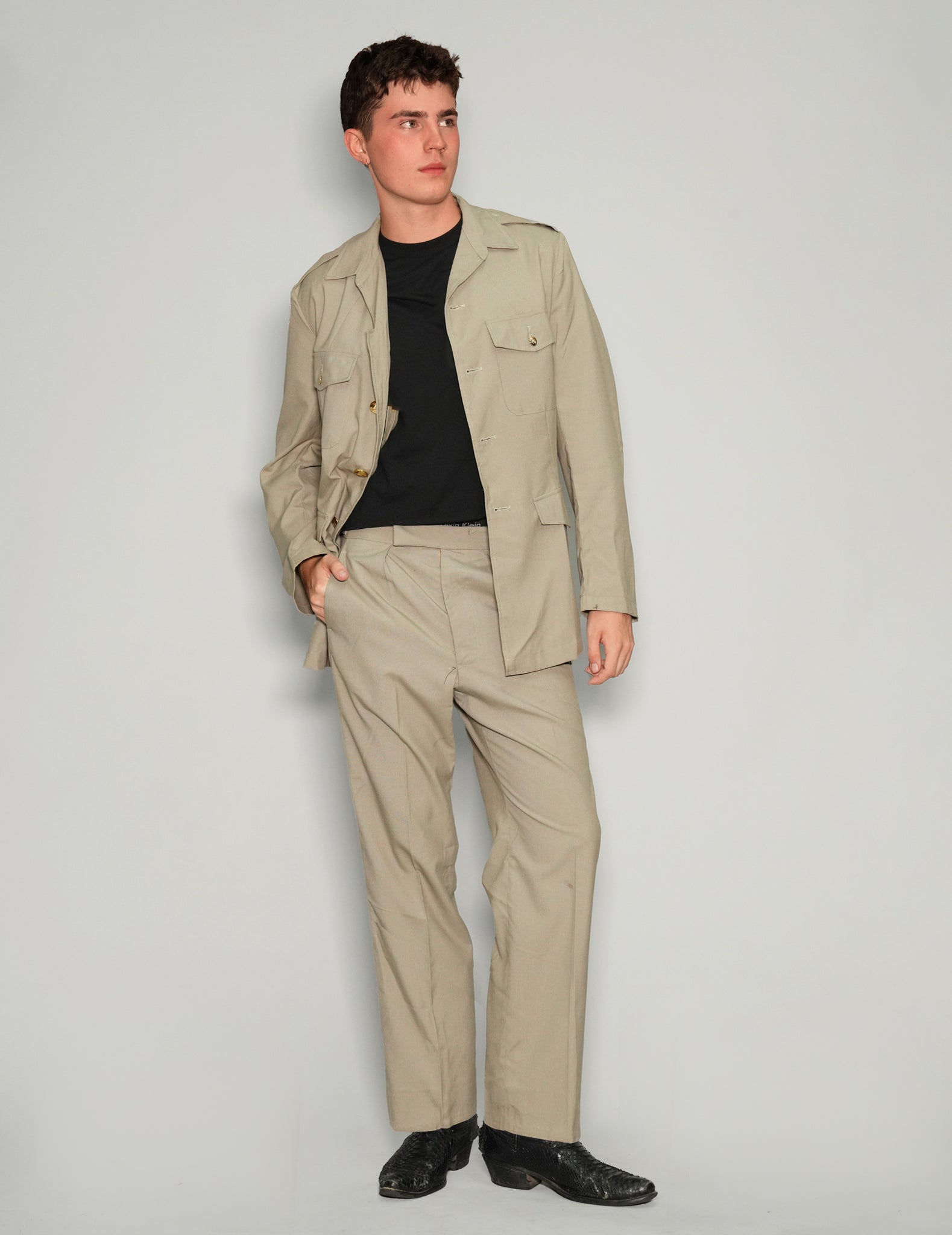 Un incroyable uniforme militaire vintage, parfait porté en tenue décontractée. Uniforme militaire n° 6 pour homme. 100 % coton. Poches poitrine à rabat, épaulettes boutonnées, fausses poches à rabat sur les hanches, fermeture à 4 boutons sur le devant, patch planeur sur l'épaule gauche et ceinture ajustable à l'intérieur. Pantalon inclus.