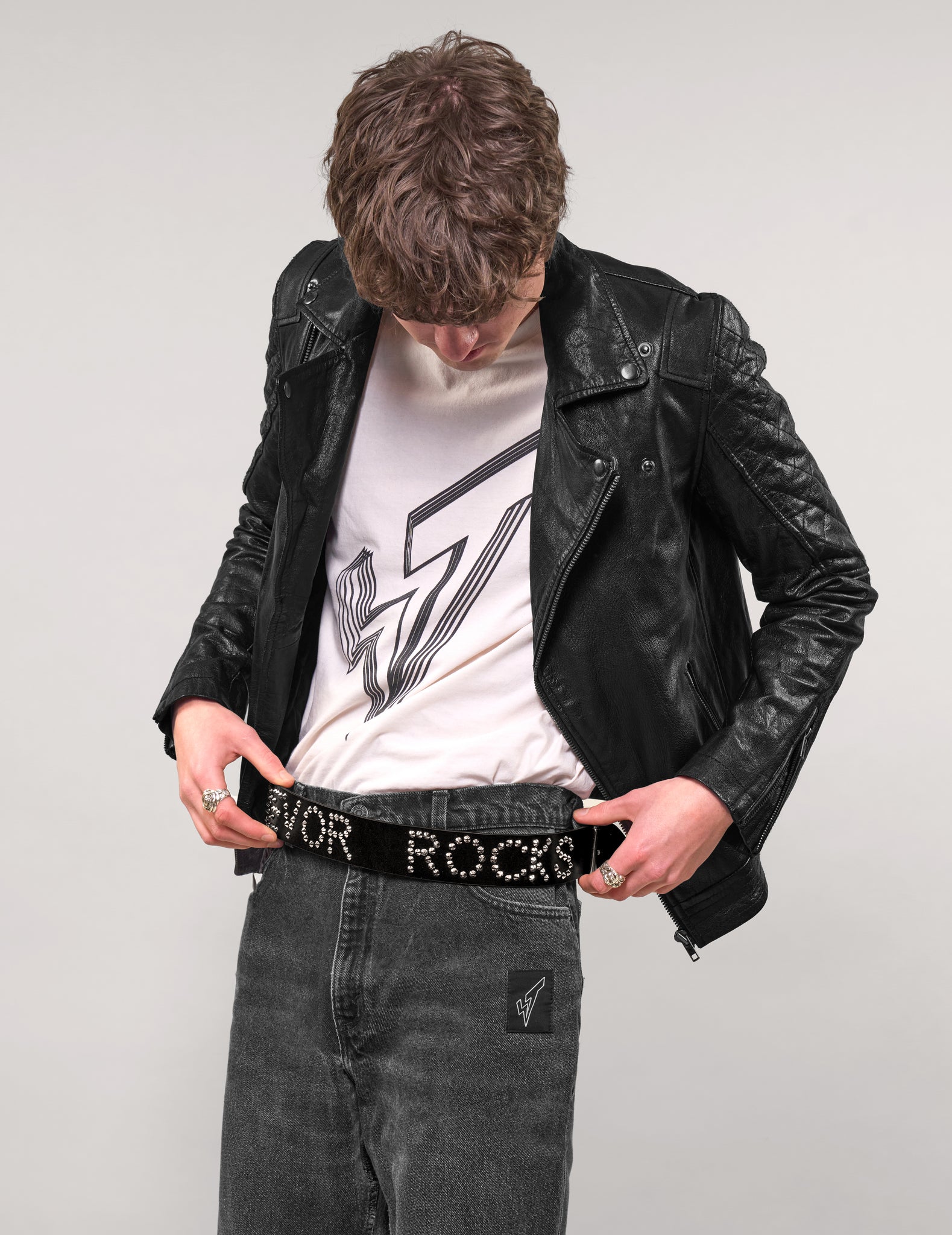 Création originale de Stuart Trevor, ces superbes ceintures cloutées en cuir sont confectionnées à partir du meilleur cuir de selle britannique, provenant d'un stock dormant. Chaque ceinture est fabriquée artisanalement avec soin dans l'est de Londres. Cette ceinture rock'n'roll arbore l'inscription « Stuart Trevor Rocks ».