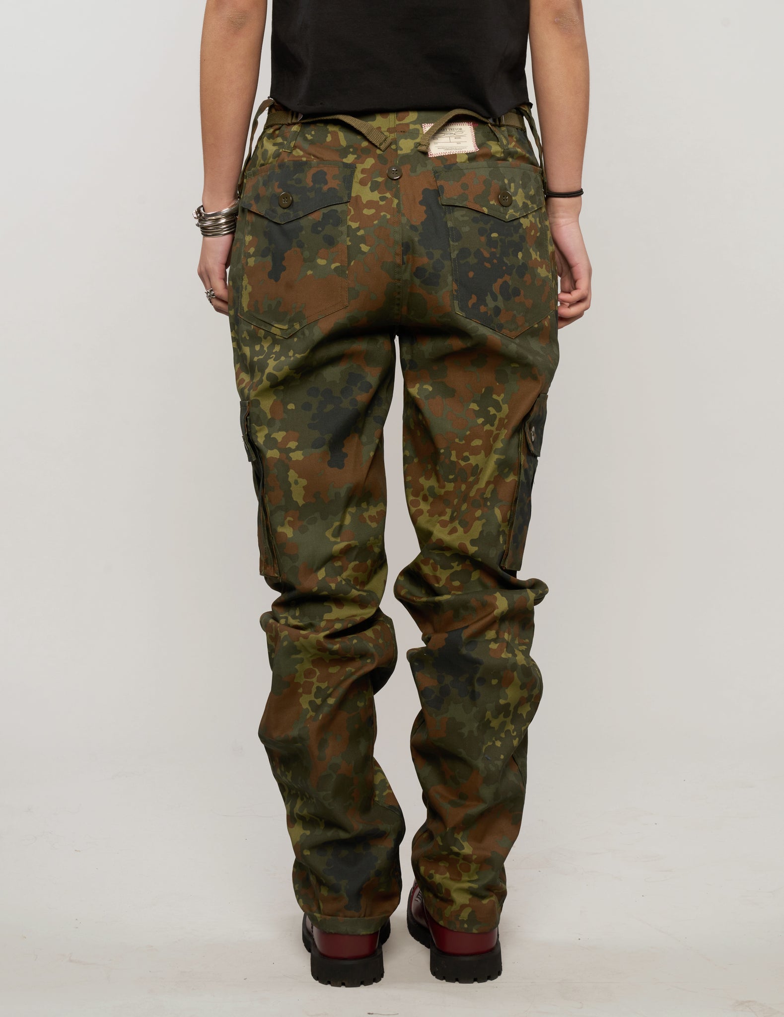 Deadstock, military cargo trousers in Flectarn camo. Features side adjustable tabs, cargo pockets on both legs and zip fastened crotch. 65% Polyester 35% Cotton.