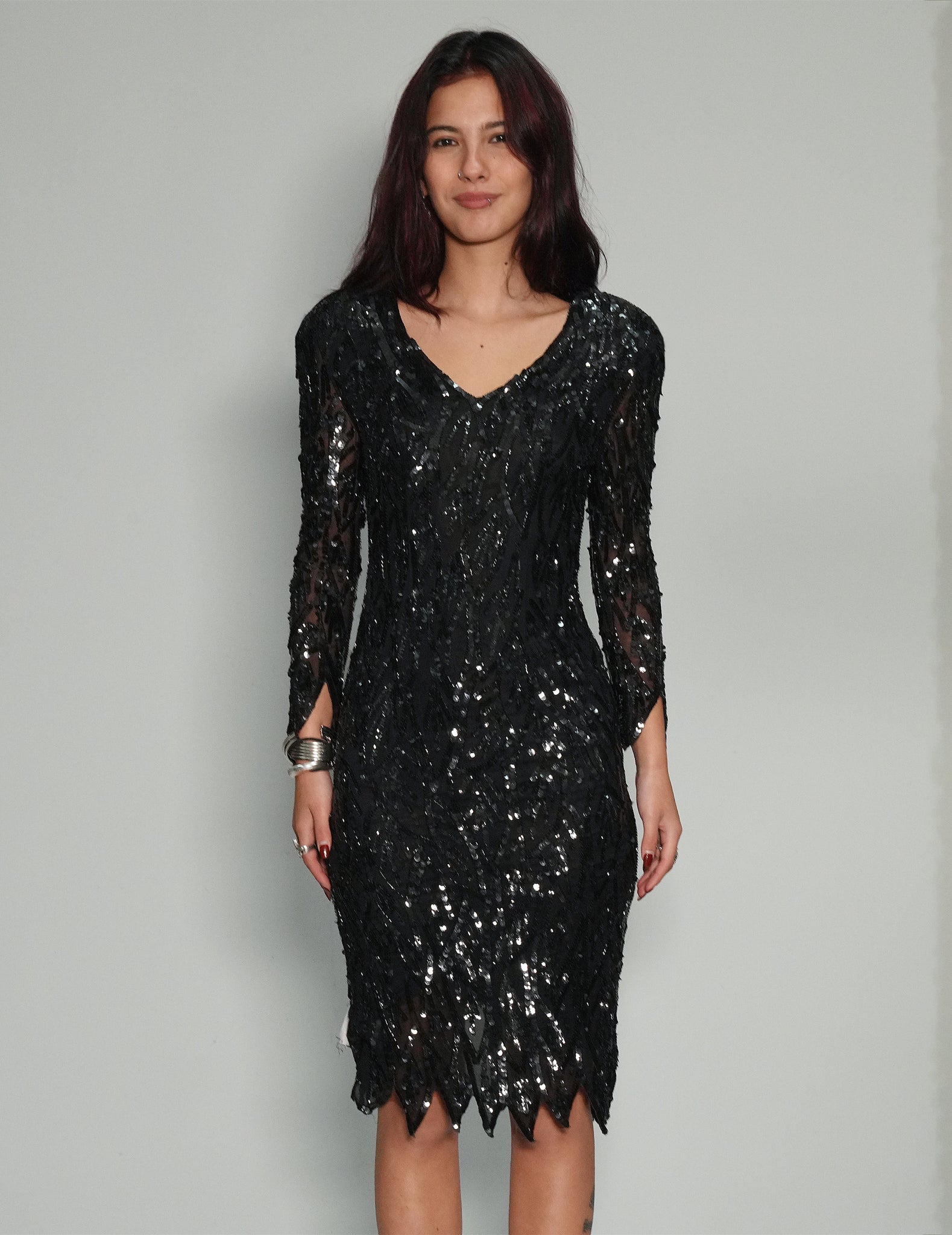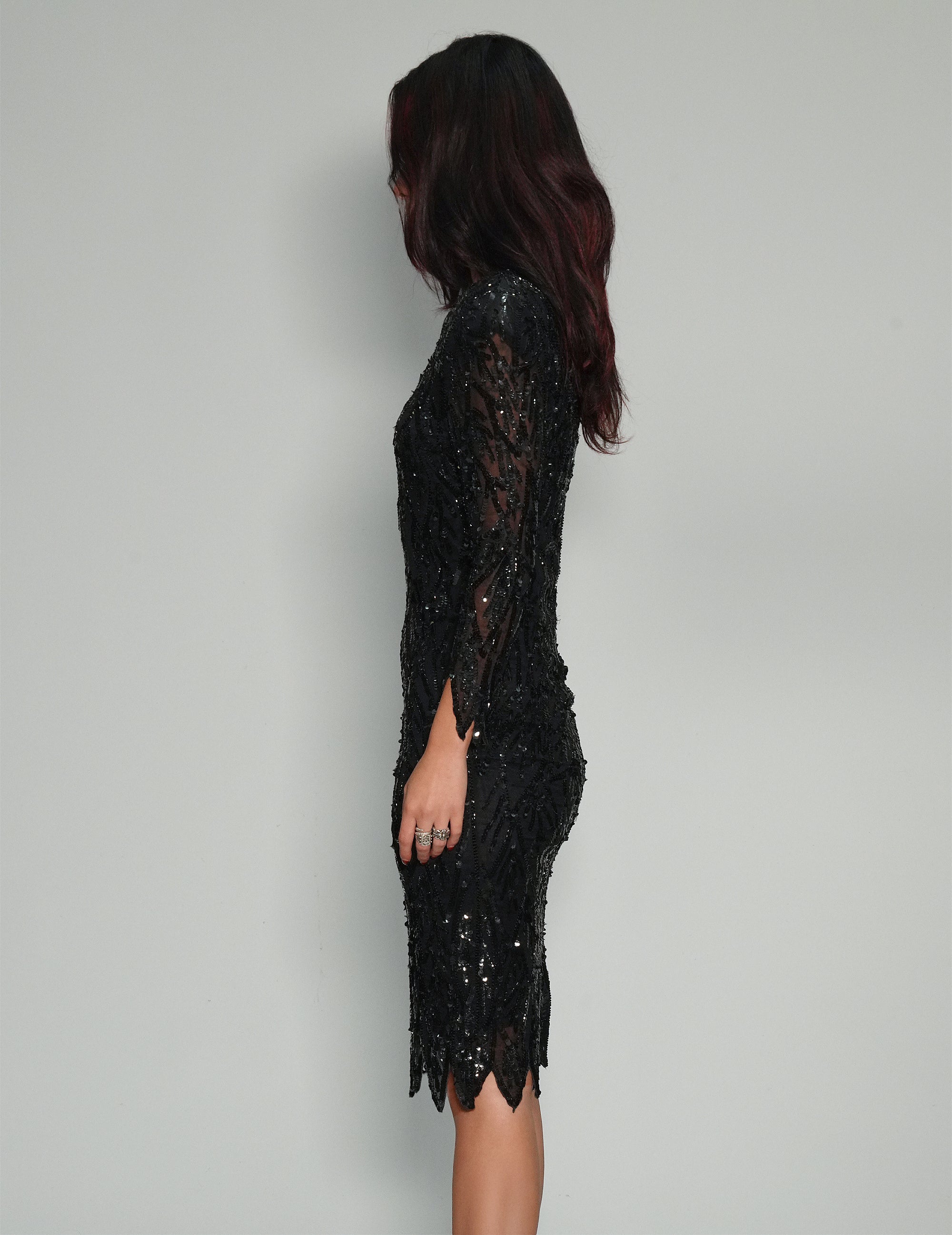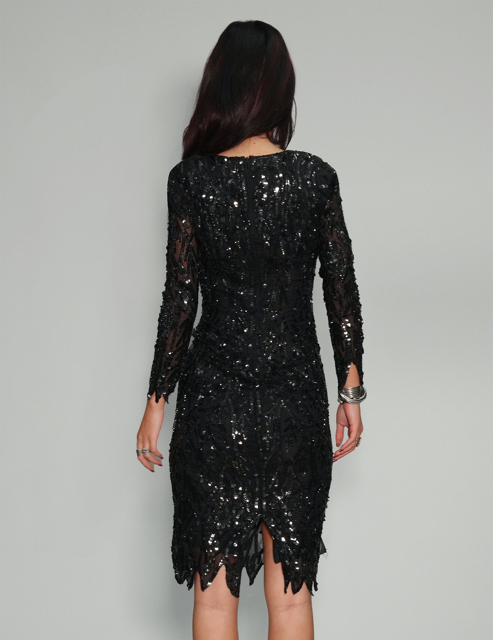 Straight from the 60s - shimmer in this breathtaking sequin dress. Its intricate detailing and body-hugging silhouette create a strikingly glamorous look. The deep black hue and sophisticated cut make it perfect for special occasions where you want to dazzle and leave a lasting impression.