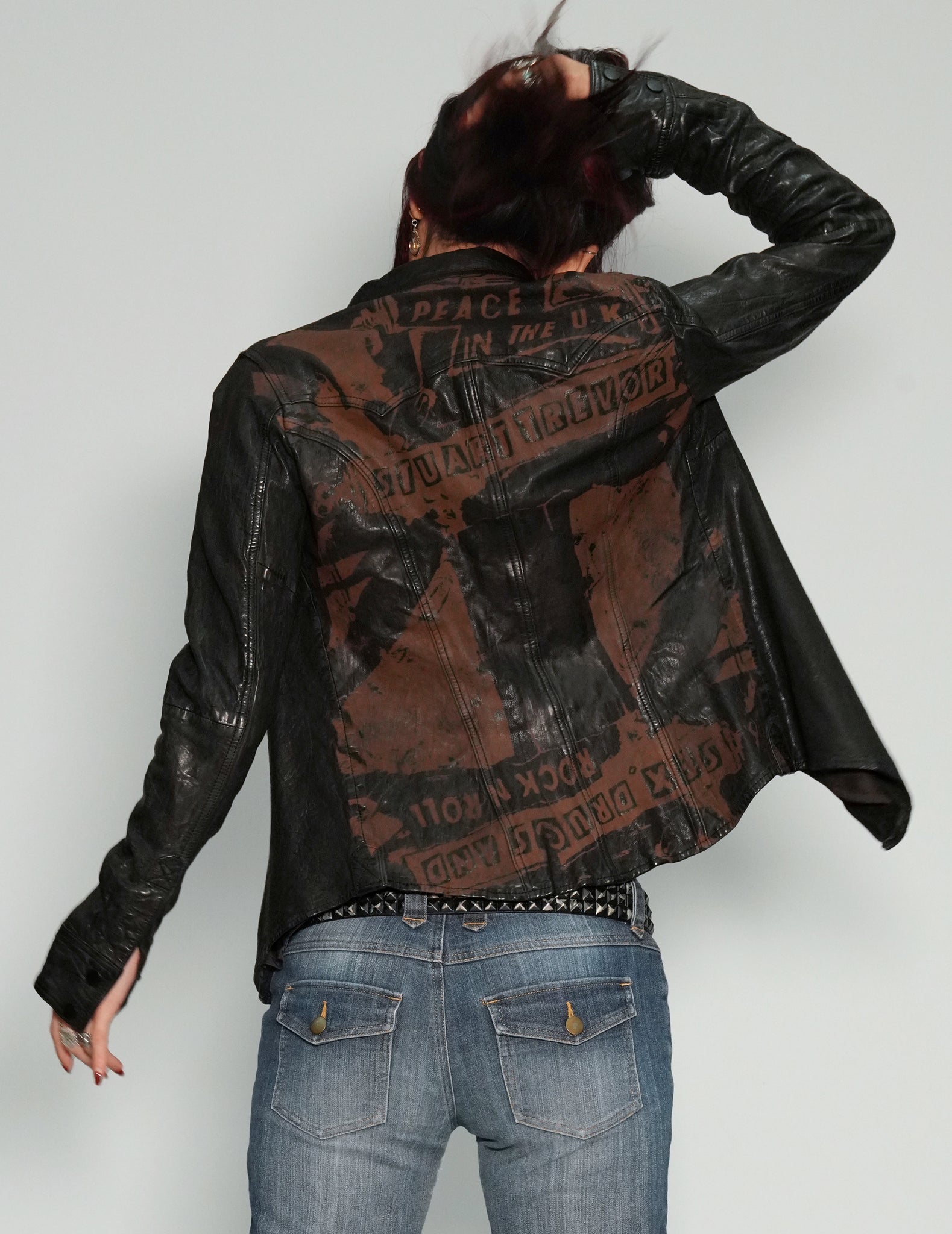 Original IMMORTAL leather laser printed in our East London tailoring shop, with our Iconic original graphic print with "Stuart Trevor, Peace in the UK, Anarchy in the World and S'x D'ugs n Rock n Roll" on the back.