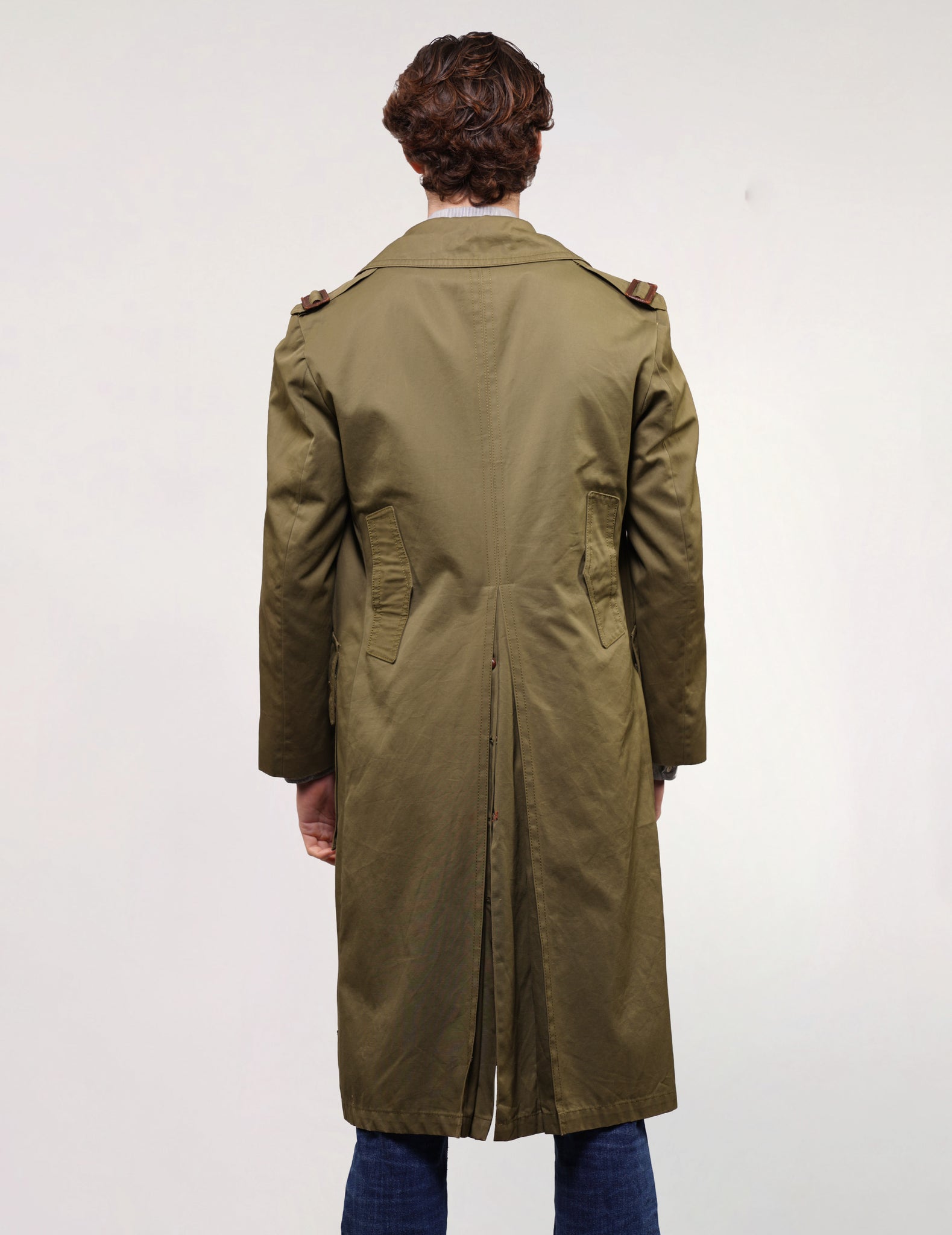Alexander’s Wide World of Fashion military trench coat. 100% cotton showerproof gabardine. Super rare, collectible vintage find made in japan,. Shoulder epaulets, sleeve tabs with leather buckles, imitation leather knot buttons with two gold military button detail and huge sawtooth flap on bellows pockets.